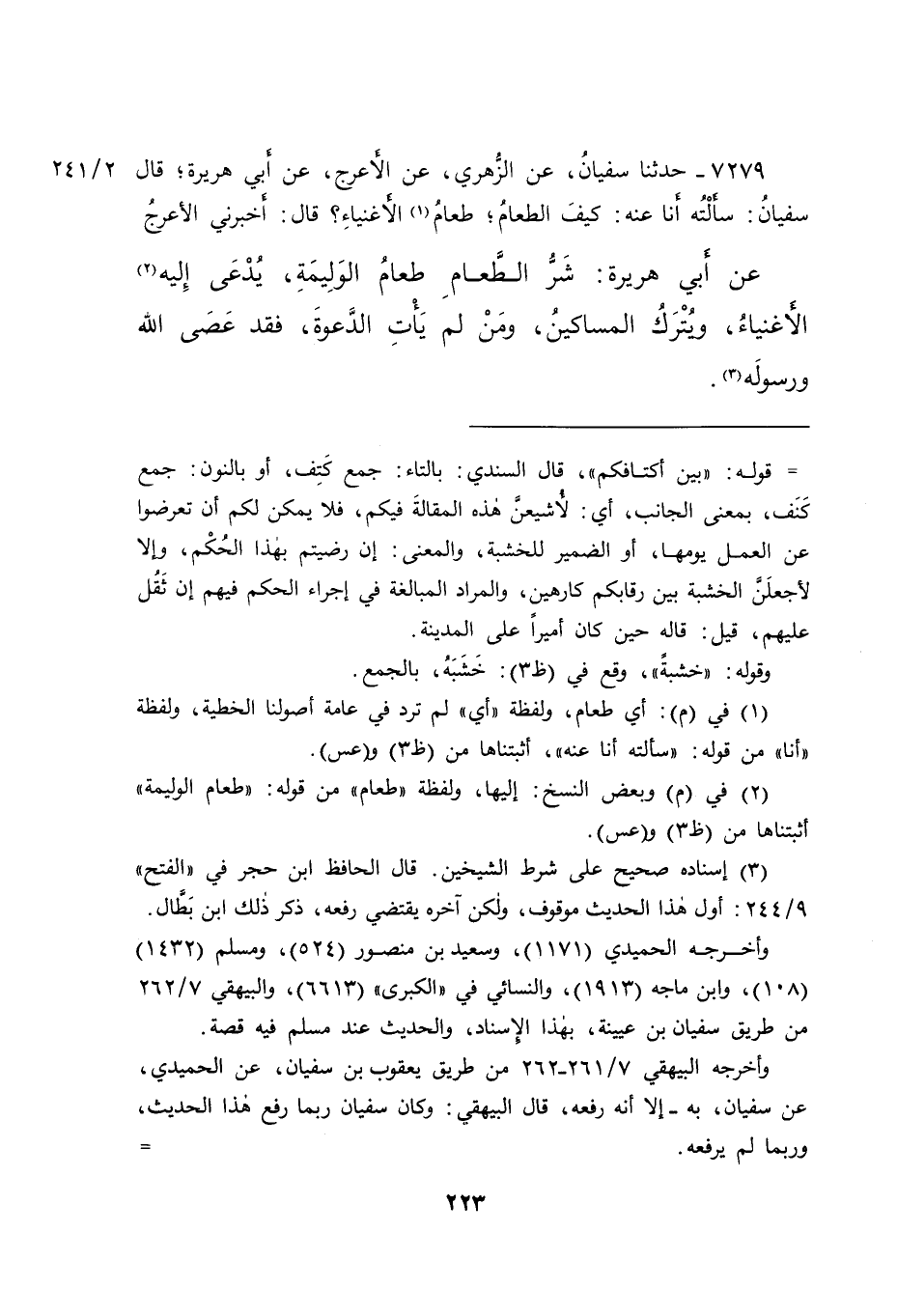٧٢٧٩ - حَدَّثَنَا سُفْيَانُ، عَنِ الزُّهْرِيِّ، عَنِ الْأَعْرَجِ، عَنْ أَبِي هُرَيْرَةَ - قَالَ سُفْيَانُ: سَأَلْتُهُ أَنَا عَنْهُ: كَيْفَ الطَّعَامُ، طَعَامَ (١) الْأَغْنِيَاءِ؟ قَالَ: أَخْبَرَنِي الْأَعْرَجُ، عَنْ أَبِي هُرَيْرَةَ -: " شَرُّ الطَّعَامِ طَعَامُ الْوَلِيمَةِ، يُدْعَى إِلَيْه (٢) الْأَغْنِيَاءُ، وَيُتْرَكُ الْمَسَاكِينُ، وَمَنْ لَمْ يَأْتِ الدَّعْوَةَ، فَقَدْ عَصَى اللهَ وَرَسُولَهُ " (٣)
