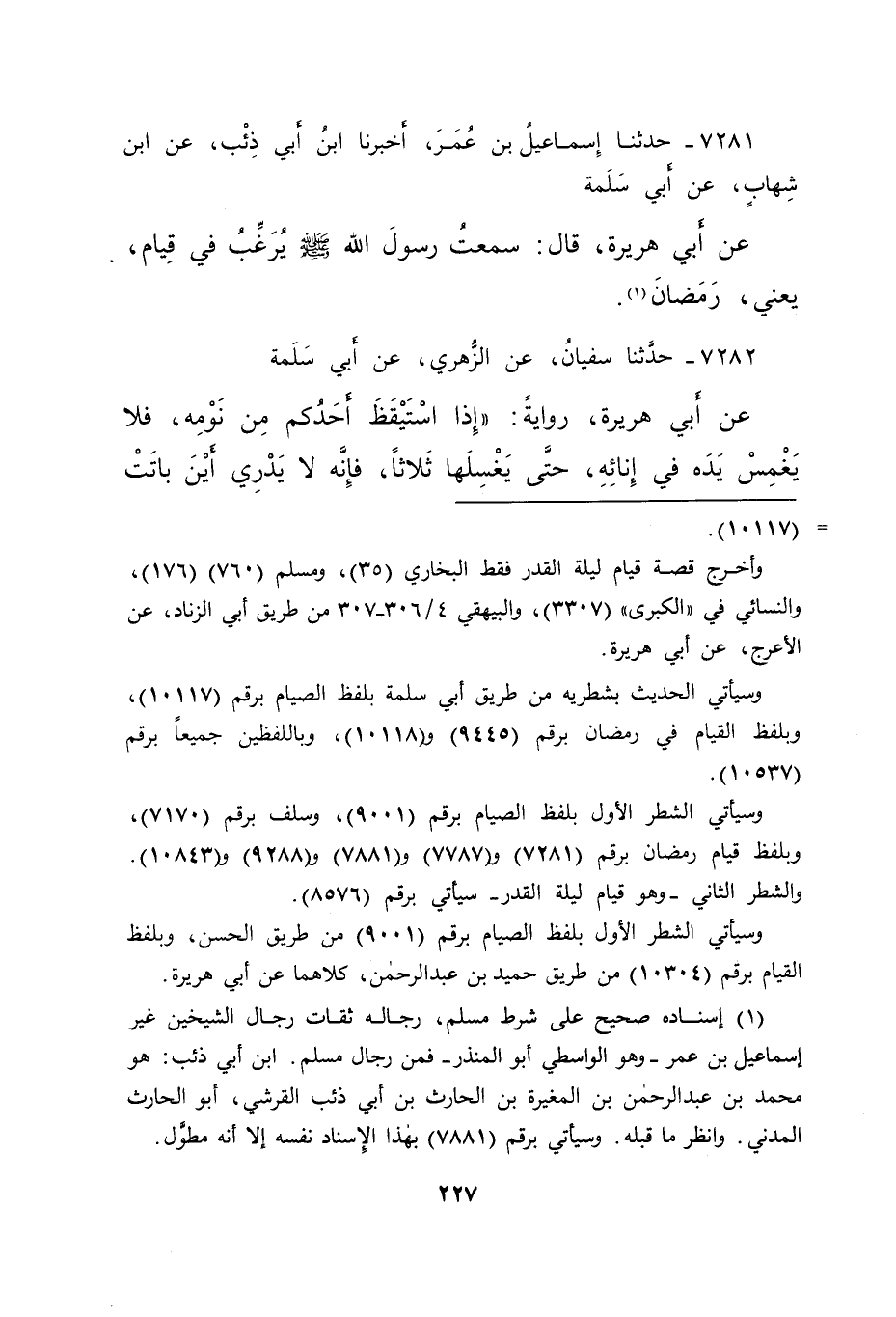 ٧٢٨١ - حَدَّثَنَا إِسْمَاعِيلُ بْنُ عُمَرَ، أَخْبَرَنَا ابْنُ أَبِي ذِئْبٍ، عَنِ ابْنِ شِهَابٍ، عَنْ أَبِي سَلَمَةَ، عَنْ أَبِي هُرَيْرَةَ، قَالَ: سَمِعْتُ رَسُولَ اللهِ صَلَّى اللهُ عَلَيْهِ وَسَلَّمَ: " يُرَغِّبُ فِي قِيَامِ "، يَعْنِي رَمَضَانَ (١)