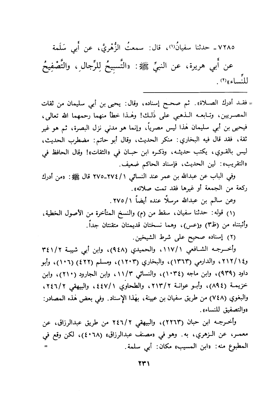 وأخرجه الشافعي ١/١١٧، والحميدي (٩٤٨) ، وابن أبي شيبة ٢/٣٤١ و١٤/٢١٢، والدارمي (١٣٦٣) ، والبخاري (١٢٠٣) ، ومسلم (٤٢٢) (١٠٦) ، وأبو داود (٩٣٩) ، وابن ماجه (١٠٣٤) ، والنسائي ٣/١١، وابن الجارود (٢١٠) ، وابن خزيمة (٨٩٤) ، وأبوعوانة ٢/٢١٣، والطحاوي ١/٤٤٧، والبيهقي ٢/٢٤٦، والبغوي (٧٤٨) من طريق سفيان بن عيينة، بهذا الإسناد. وفي بعض هذه المصادر: "والتصفيق للنساء".