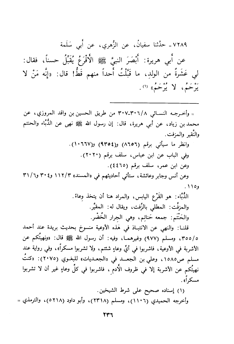 ٧٢٨٩ - حَدَّثَنَا سُفْيَانُ، عَنِ الزُّهْرِيِّ، عَنْ أَبِي سَلَمَةَ، عَنْ أَبِي هُرَيْرَةَ: أَبْصَرَ النَّبِيَّ صَلَّى اللهُ عَلَيْهِ وَسَلَّمَ الْأَقْرَعُ يُقَبِّلُ حَسَنًا، فَقَالَ: لِي عَشْرَةٌ مِنَ الْوَلَدِ، مَا قَبَّلْتُ أَحَدًا مِنْهُمْ قَطُّ قَالَ: " إِنَّهُ مَنْ لَا يَرْحَمُ، لَا يُرْحَمُ " (١)