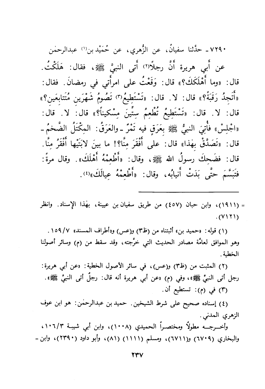 ٧٢٩٠ - حَدَّثَنَا سُفْيَانُ، عَنِ الزُّهْرِيِّ، عَنْ حُمَيْدِ بْنِ (١) عَبْدِ الرَّحْمَنِ، عَنْ أَبِي هُرَيْرَةَ، أَنَّ رَجُلًا (٢) أَتَى النَّبِيَّ صَلَّى اللهُ عَلَيْهِ وَسَلَّمَ، فَقَالَ: هَلَكْتُ. قَالَ: " وَمَا أَهْلَكَكَ؟ " قَالَ: وَقَعْتُ عَلَى امْرَأَتِي فِي رَمَضَانَ. فَقَالَ: " أَتَجِدُ رَقَبَةً؟ " قَالَ: لَا. قَالَ: " تَسْتَطِيعُ (٣) أَنْ تَصُومَ شَهْرَيْنِ مُتَتَابِعَيْنِ؟ " قَالَ: لَا. قَالَ: " تَسْتَطِيعُ تُطْعِمُ سِتِّينَ مِسْكِينًا؟ " قَالَ: لَا. قَالَ: " اجْلِسْ " فَأُتِيَ النَّبِيُّ صَلَّى اللهُ عَلَيْهِ وَسَلَّمَ بِعَرْقٍ فِيهِ تَمْرٌ - وَالْعَرْقُ: الْمِكْتَلُ الضَّخْمُ - قَالَ: " تَصَدَّقْ بِهَذَا " قَالَ: عَلَى أَفْقَرَ مِنَّا؟ مَا بَيْنَ لَابَتَيْهَا أَفْقَرُ مِنَّا، قَالَ: فَضَحِكَ رَسُولُ اللهِ صَلَّى اللهُ عَلَيْهِ وَسَلَّمَ، وَقَالَ: " أَطْعِمْهُ أَهْلَكَ " وَقَالَ مَرَّةً: فَتَبَسَّمَ حَتَّى بَدَتْ أَنْيَابُهُ، وَقَالَ: " أَطْعِمْهُ عِيَالَكَ " (٤)
