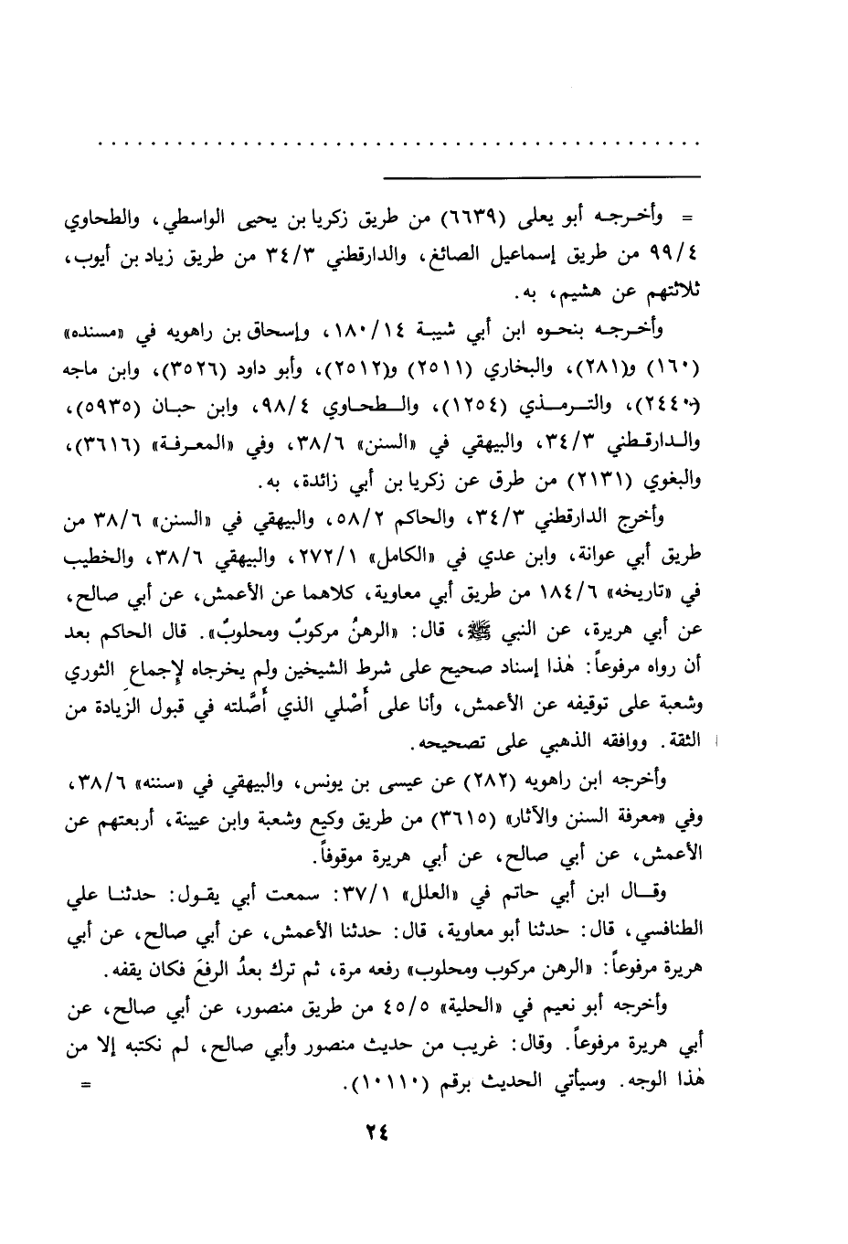وأخرج الدارقطني ٣/٣٤، والحاكم ٢/٥٨، والبيهقي في "السنن" ٦/٣٨ من طريق أبي عوانة، وابن عدي في "الكامل" ١/٢٧٢، والبيهقي ٦/٣٨، والخطيب في "تاريخه" ٦/١٨٤ من طريق أبي معاوية، كلاهما عن الأعمش، عن أبي صالح، عن أبي هريرة، عن النبي صَلَّى اللهُ عَلَيْهِ وَسَلَّمَ، قال: "الرهن مركوب ومحلوب". قال الحاكم بعد أن رواه مرفوعا: هذا إسناد صحيح على شرط الشيخين ولم يخرجاه لإجماع الثوري وشعبة على توقيفه عن الأعمش، وأنا على أصلي الذي أصلته في قبول الزيادة من الثقة. ووافقه الذهبي على تصحيحه.