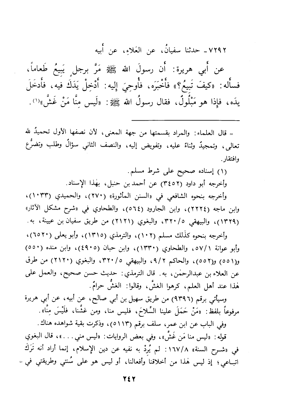 ٧٢٩٢ - حَدَّثَنَا سُفْيَانُ، عَنِ الْعَلَاءِ، عَنْ أَبِيهِ، عَنْ أَبِي هُرَيْرَةَ، أَنَّ رَسُولَ اللهِ صَلَّى اللهُ عَلَيْهِ وَسَلَّمَ مَرَّ بِرَجُلٍ يَبِيعُ طَعَامًا، فَسَأَلَهُ: " كَيْفَ تَبِيعُ؟ " فَأَخْبَرَهُ، فَأُوحِيَ إِلَيْهِ: أَدْخِلْ يَدَكَ فِيهِ، فَأَدْخَلَ يَدَهُ، فَإِذَا هُوَ مَبْلُولٌ، فَقَالَ رَسُولُ اللهِ صَلَّى اللهُ عَلَيْهِ وَسَلَّمَ: " لَيْسَ مِنَّا مَنْ غَشَّ " (١)
