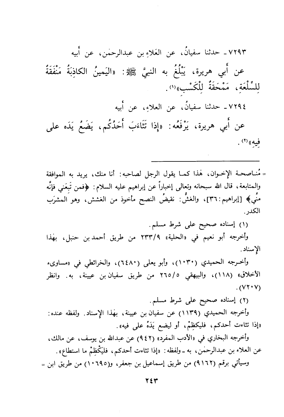 ٧٢٩٤ - حَدَّثَنَا سُفْيَانُ، عَنِ الْعَلَاءِ، عَنْ أَبِيهِ، عَنْ أَبِي هُرَيْرَةَ، يَرْفَعُهُ: " إِذَا تَثَاءَبَ أَحَدُكُمْ، يَضَعُ يَدَهُ عَلَى فِيهِ " (٢)