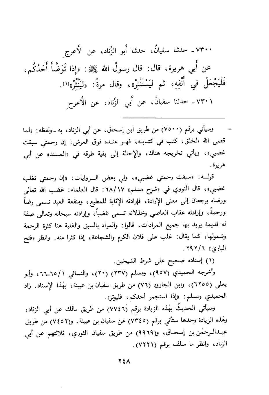 ٧٣٠٠ - حَدَّثَنَا سُفْيَانُ، حَدَّثَنَا أَبُو الزِّنَادِ، عَنِ الْأَعْرَجِ، عَنْ أَبِي هُرَيْرَةَ، قَالَ: قَالَ رَسُولُ اللهِ صَلَّى اللهُ عَلَيْهِ وَسَلَّمَ: " إِذَا تَوَضَّأَ أَحَدُكُمْ، فَلْيَجْعَلْ فِي أَنْفِهِ، ثُمَّ لِيَسْتَنْثِرْ " وَقَالَ مَرَّةً: " لِيَنْثُرْ " (١)