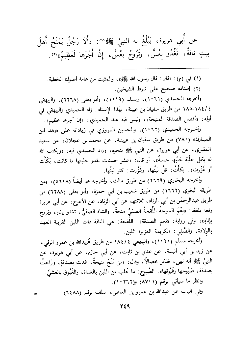 عَنْ أَبِي هُرَيْرَةَ يَبْلُغُ بِهِ النَّبِيَّ صَلَّى اللهُ عَلَيْهِ وَسَلَّمَ (١) : " أَلَا رَجُلٌ يَمْنَحُ أَهْلَ بَيْتٍ نَاقَةً، تَغْدُو بِعُسٍّ، وَتَرُوحُ بِعُسٍّ، إِنَّ أَجْرَهَا لَعَظِيمٌ " (٢)