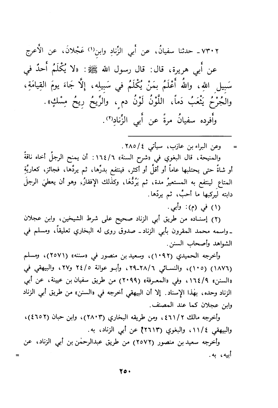 ٧٣٠٢ - حَدَّثَنَا سُفْيَانُ، عَنْ أَبِي الزِّنَادِ، وَابْنِ (١) عَجْلَانَ، عَنْ الْأَعْرَجِ، عَنْ أَبِي هُرَيْرَةَ، قَالَ: قَالَ رَسُولُ اللهِ صَلَّى اللهُ عَلَيْهِ وَسَلَّمَ: " لَا يُكْلَمُ أَحَدٌ فِي سَبِيلِ اللهِ، وَاللهُ أَعْلَمُ بِمَنْ يُكْلَمُ فِي سَبِيلِهِ، إِلَّا جَاءَ يَوْمَ الْقِيَامَةِ، وَالْجُرْحُ يَثْعَبُ دَمًا، اللَّوْنُ لَوْنُ دَمٍ، وَالرِّيحُ رِيحُ مِسْكٍ " " وَأَفْرَدَهُ سُفْيَانُ مَرَّةً عَنْ أَبِي الزِّنَادِ " (٢)