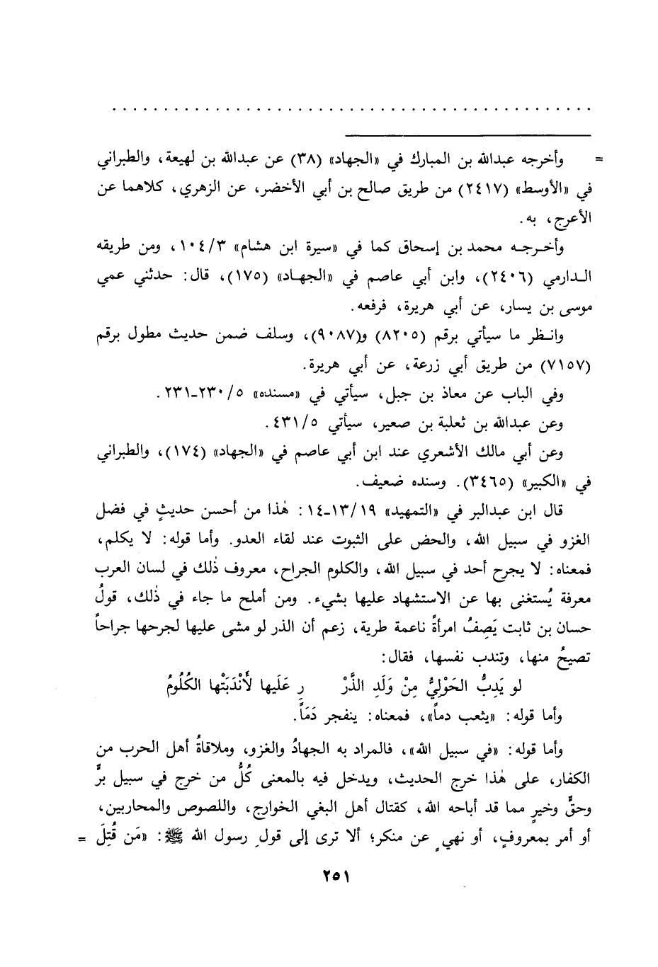 قال ابن عبد البر في "التمهيد" ١٣/١٩-١٤: هذا من أحسن حديث في فضل الغزو في سبيل الله، والحض على الثبوت عند لقاء العدو. وأما قوله: لا يكلم، فمعناه: لا يجرح أحد في سبيل الله، والكلوم الجراح، معروف ذلك في لسان العرب معرفة يستغنى بها عن الاستشهاد عليها بشيء. ومن أملح ما جاء في ذلك، قول حسان بن ثابت يصف امرأة ناعمة طرية، زعم أن الذر لو مشى عليها لجرحها جراحا تصيح منها، وتندب نفسها، فقال:
