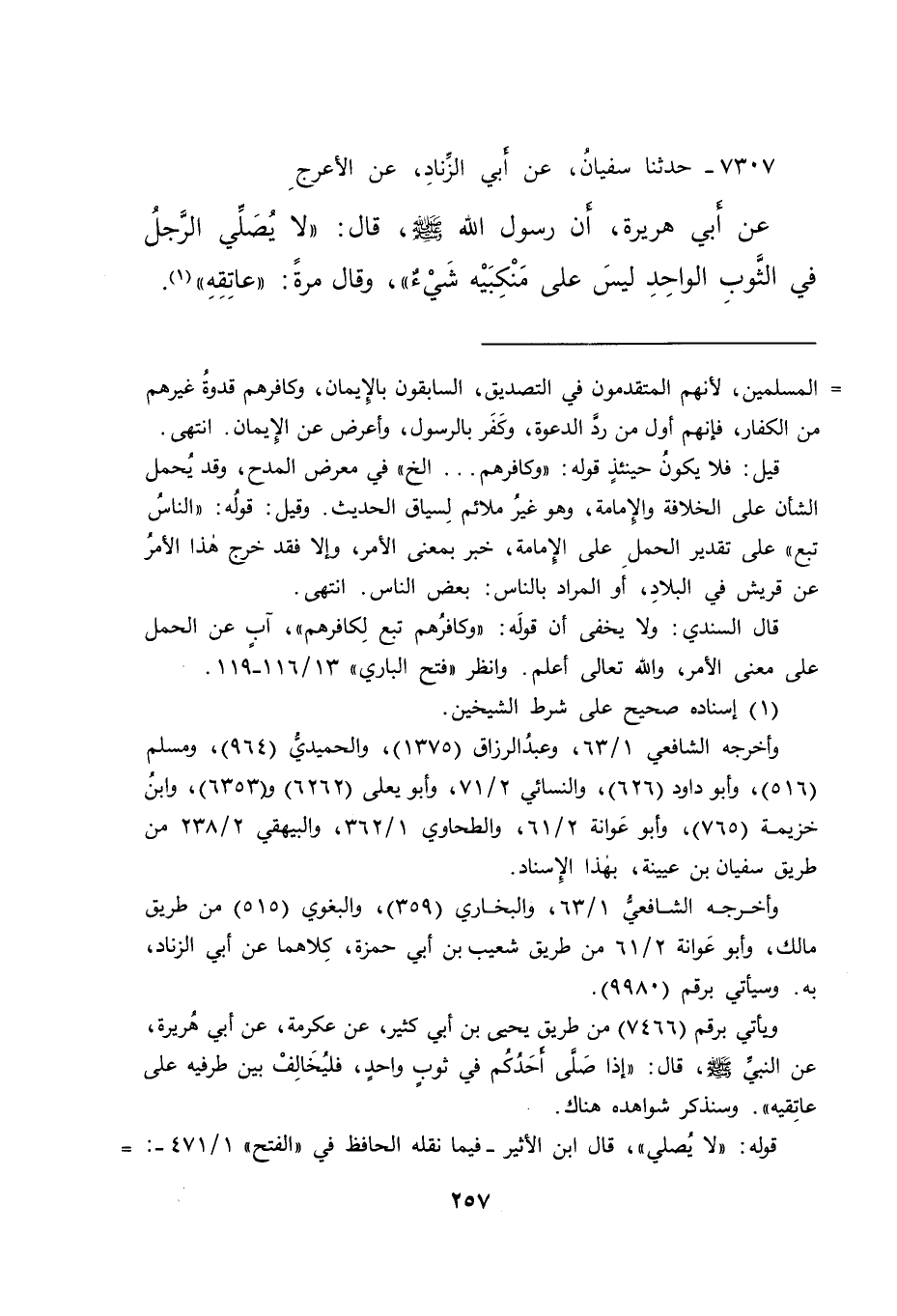 ٧٣٠٧ - حَدَّثَنَا سُفْيَانُ، عَنْ أَبِي الزِّنَادِ، عَنِ الْأَعْرَجِ، عَنْ أَبِي هُرَيْرَةَ، أَنَّ رَسُولَ اللهِ صَلَّى اللهُ عَلَيْهِ وَسَلَّمَ قَالَ: " لَا يُصَلِّي الرَّجُلُ فِي الثَّوْبِ الْوَاحِدِ لَيْسَ عَلَى مَنْكِبَيْهِ شَيْءٌ " وَقَالَ مَرَّةً: " عَاتِقِهِ " (١)