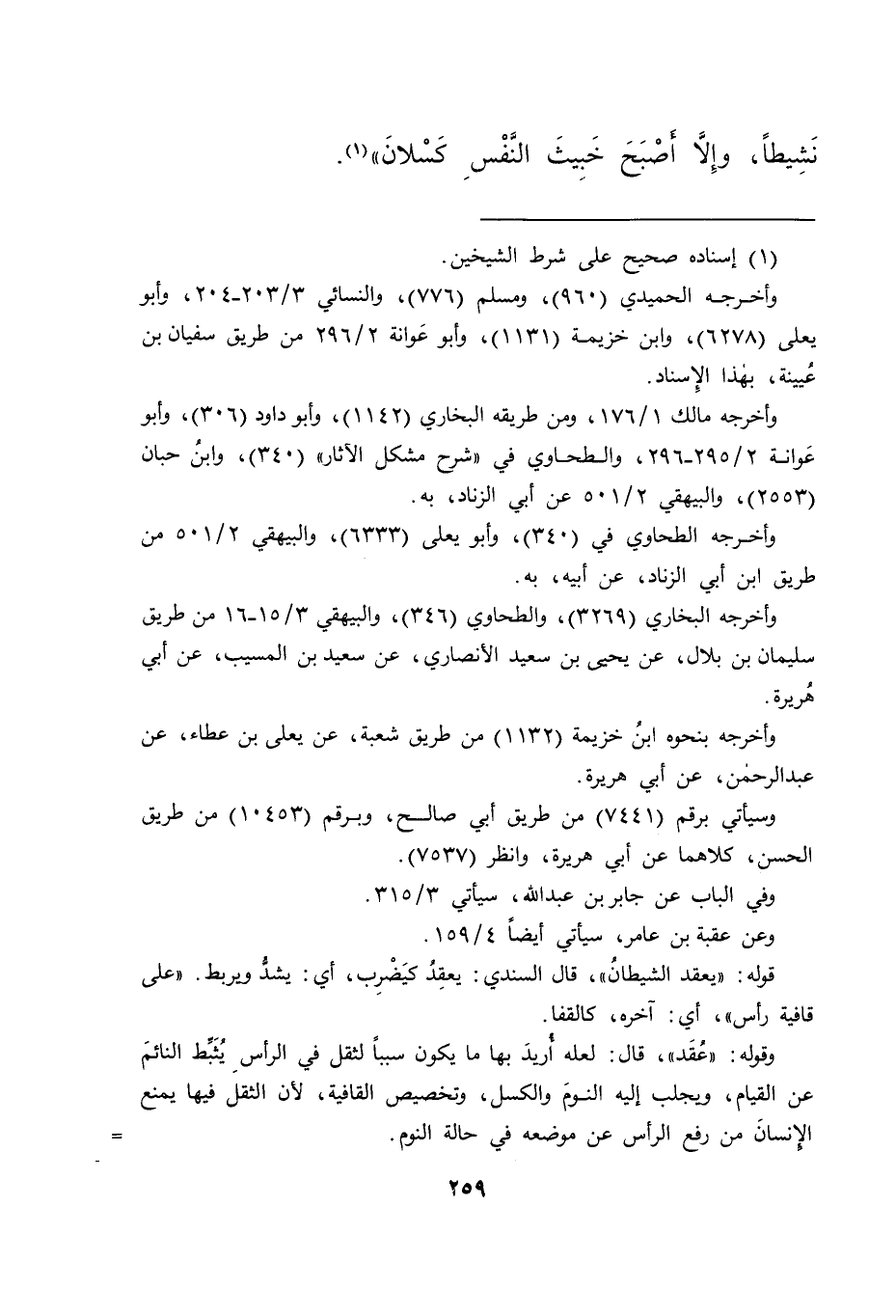 وقوله: "عقد"، قال: لعله أريد بها ما يكون سببا لثقل في الرأس يثبط النائم عن القيام، ويجلب إليه النوم والكسل، وتخصيص القافية، لأن الثقل فيها يمنع الإنسان من رفع الرأس عن موضعه في حالة النوم.=