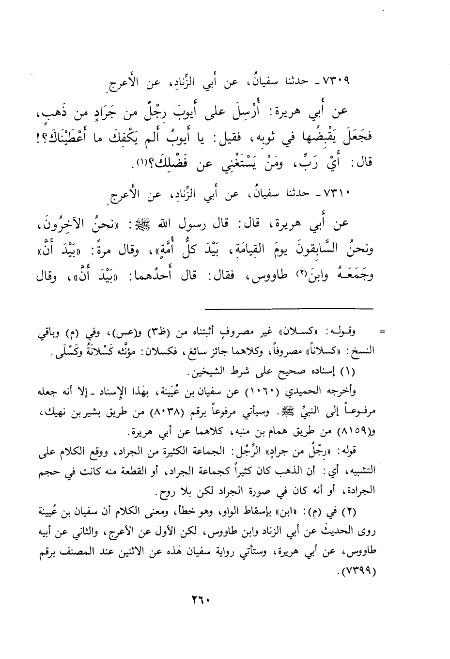 ٧٣١٠ - حَدَّثَنَا سُفْيَانُ، عَنْ أَبِي الزِّنَادِ، عَنِ الْأَعْرَجِ، عَنْ أَبِي هُرَيْرَةَ، قَالَ: قَالَ رَسُولُ اللهِ صَلَّى اللهُ عَلَيْهِ وَسَلَّمَ: " نَحْنُ الْآخِرُونَ، وَنَحْنُ السَّابِقُونَ يَوْمَ الْقِيَامَةِ، بَيْدَ كُلِّ أُمَّةٍ - وَقَالَ مَرَّةً: بَيْدَ أَنَّ، وَجَمَعَهُ وابْنُ (٢) طَاوُسٍ، فَقَالَ: قَالَ أَحَدُهُمَا: بَيْدَ أَنَّ، وَقَالَ