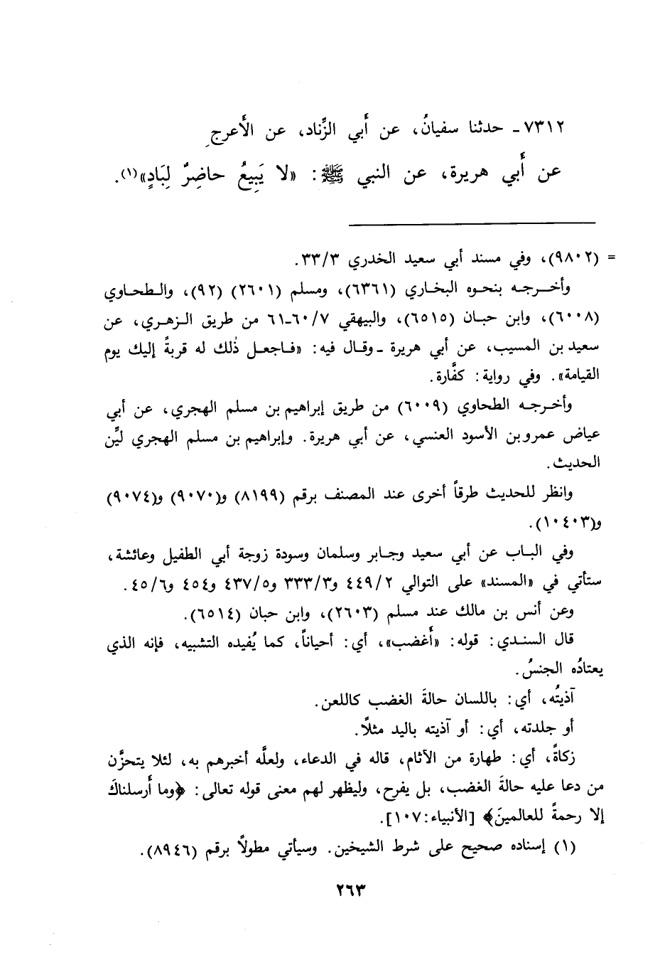 ٧٣١٢ - حَدَّثَنَا سُفْيَانُ، عَنْ أَبِي الزِّنَادِ، عَنِ الْأَعْرَجِ، عَنْ أَبِي هُرَيْرَةَ، عَنِ النَّبِيِّ صَلَّى اللهُ عَلَيْهِ وَسَلَّمَ: " لَا يَبِيعُ حَاضِرٌ لِبَادٍ " (١)