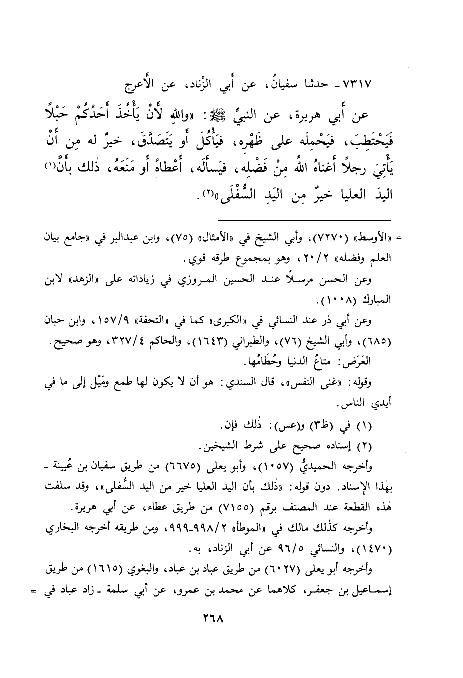 ٧٣١٧ - حَدَّثَنَا سُفْيَانُ، عَنْ أَبِي الزِّنَادِ، عَنِ الْأَعْرَجِ، عَنْ أَبِي هُرَيْرَةَ، عَنِ النَّبِيِّ صَلَّى اللهُ عَلَيْهِ وَسَلَّمَ: " وَاللهِ لَأَنْ يَأْخُذَ أَحَدُكُمْ حَبْلًا فَيَحْتَطِبَ فَيَحْمِلَهُ عَلَى ظَهْرِهِ، فَيَأْكُلَ أَوْ يَتَصَدَّقَ، خَيْرٌ لَهُ مِنْ أَنْ يَأْتِيَ رَجُلًا أَغْنَاهُ اللهُ مِنْ فَضْلِهِ، فَيَسْأَلَهُ، أَعْطَاهُ أَوْ مَنَعَهُ، ذَلِكَ بِأَنَّ (١) الْيَدَ الْعُلْيَا خَيْرٌ مِنَ الْيَدِ السُّفْلَى " (٢)