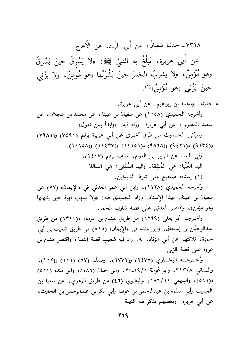 ٧٣١٨ - حَدَّثَنَا سُفْيَانُ، عَنْ أَبِي الزِّنَادِ، عَنِ الْأَعْرَجِ، عَنْ أَبِي هُرَيْرَةَ، يَبْلُغُ بِهِ النَّبِيَّ صَلَّى اللهُ عَلَيْهِ وَسَلَّمَ: " لَا يَسْرِقُ حِينَ يَسْرِقُ، وَهُوَ مُؤْمِنٌ، وَلَا يَشْرَبُ الْخَمْرَ حِينَ يَشْرَبُهَا وَهُوَ مُؤْمِنٌ، وَلَا يَزْنِي حِينَ يَزْنِي وَهُوَ مُؤْمِنٌ " (١)