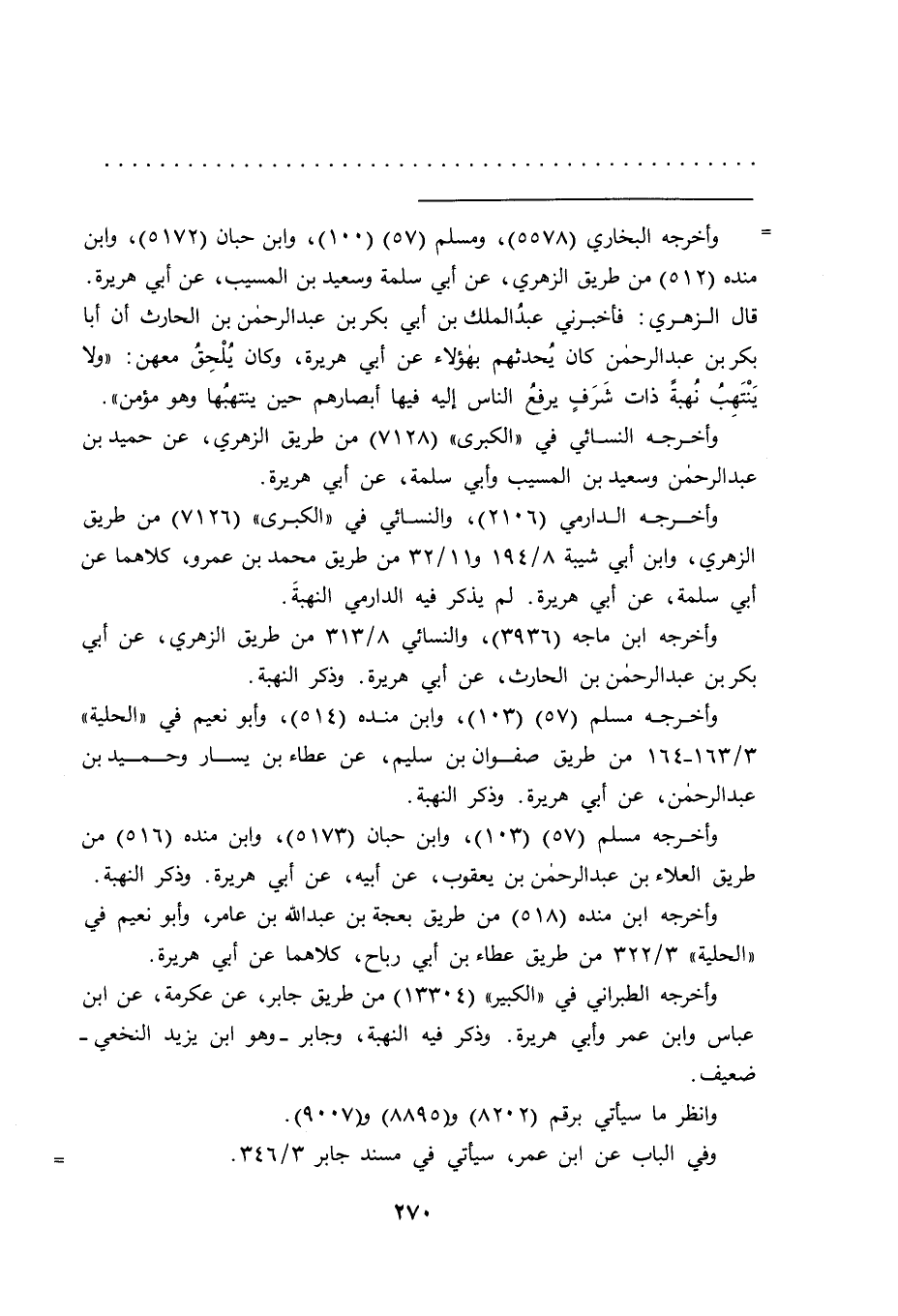 قال الزهري: فأخبرني عبد الملك بن أبي بكر بن عبد الرحمن بن الحارث أن أبا بكر بن عبد الرحمن كان يحدثهم بهؤلاء عن أبي هريرة، وكان يلحق معهن: "ولا ينتهب نهبة ذات شرف يرفع الناس إليه فيها أبصارهم حين ينتهبها وهو مؤمن" وأخرجه النسائي في "الكبرى" (٧١٢٨) من طريق الزهري، عن حميد بن عبد الرحمن وسعيد بن المسيب وأبي سلمة، عن أبي هريرة.