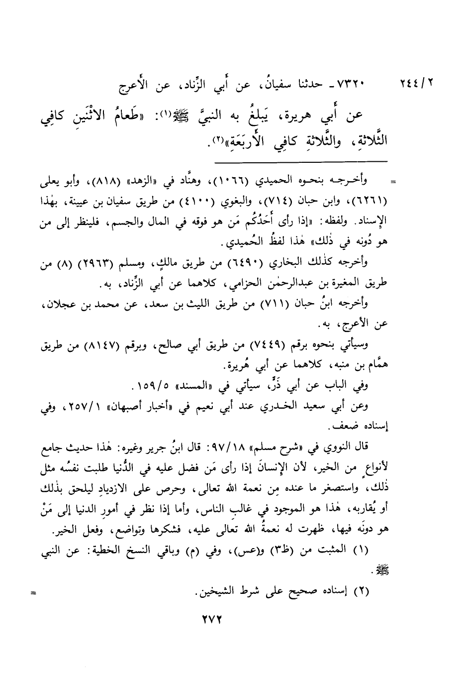 ٧٣٢٠ - حَدَّثَنَا سُفْيَانُ، عَنْ أَبِي الزِّنَادِ، عَنِ الْأَعْرَجِ، عَنْ أَبِي هُرَيْرَةَ يَبْلُغُ بِهِ النَّبِيَّ صَلَّى اللهُ عَلَيْهِ وَسَلَّمَ (١) : " طَعَامُ الِاثْنَيْنِ كَافِي الثَّلَاثَةِ، وَالثَّلَاثَةِ كَافِي الْأَرْبَعَةِ " (٢)