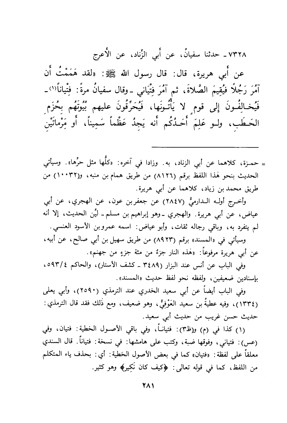 ٧٣٢٨ - حَدَّثَنَا سُفْيَانُ، عَنْ أَبِي الزِّنَادِ، عَنِ الْأَعْرَجِ، عَنْ أَبِي هُرَيْرَةَ، قَالَ: قَالَ رَسُولُ اللهِ صَلَّى اللهُ عَلَيْهِ وَسَلَّمَ: " لَقَدْ هَمَمْتُ أَنْ آمُرَ رَجُلًا فَيُقِيمَ الصَّلَاةَ، ثُمَّ آمُرَ فِتْيَانِي - وَقَالَ سُفْيَانُ مَرَّةً: فِتْيَانًا (١) - فَيُخَالِفُونَ إِلَى قَوْمٍ لَا يَأْتُونَهَا، فَيُحَرِّقُونَ عَلَيْهِمْ بُيُوتَهُمْ بِحُزَمِ الْحَطَبِ، وَلَوْ عَلِمَ أَحَدُكُمْ أَنَّهُ يَجِدُ عَظْمًا سَمِينًا، أَوْ مِرْمَاتَيْنِ