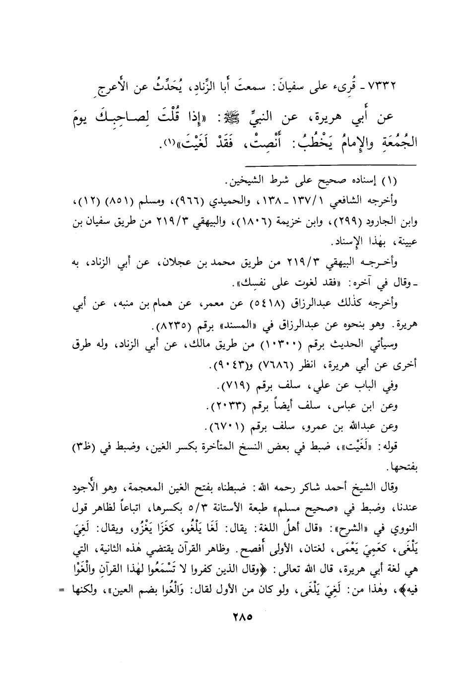 ٧٣٣٢ - قُرِئَ عَلَى سُفْيَانَ: سَمِعْتُ أَبَا الزِّنَادِ، يُحَدِّثُ عَنِ الْأَعْرَجِ، عَنْ أَبِي هُرَيْرَةَ، عَنِ النَّبِيِّ صَلَّى اللهُ عَلَيْهِ وَسَلَّمَ: " إِذَا قُلْتَ لِصَاحِبِكَ يَوْمَ الْجُمُعَةِ وَالْإِمَامُ يَخْطُبُ: أَنْصِتْ، فَقَدْ لَغَيْتَ " (١)