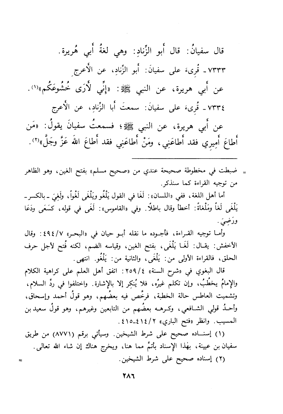 ٧٣٣٤ - قُرِئَ عَلَى سُفْيَانَ، سَمِعْتُ أَبَا الزِّنَادِ، عَنِ الْأَعْرَجِ، عَنْ أَبِي هُرَيْرَةَ، عَنِ النَّبِيِّ صَلَّى اللهُ عَلَيْهِ وَسَلَّمَ، - فَسَمِعْتُ سُفْيَانَ يَقُولُ - " مَنْ أَطَاعَ أَمِيرِي فَقَدْ أَطَاعَنِي، وَمَنْ أَطَاعَنِي فَقَدْ أَطَاعَ اللهَ عَزَّ وَجَلَّ " (٢)