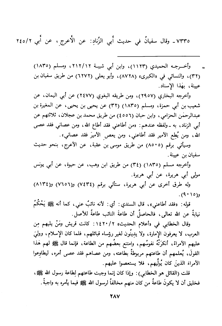 ٧٣٣٥ - وقَالَ سُفْيَانُ فِي حَدِيثِ أَبِي الزِّنَادِ: عَنِ الْأَعْرَجِ، عَنْ أَبِي