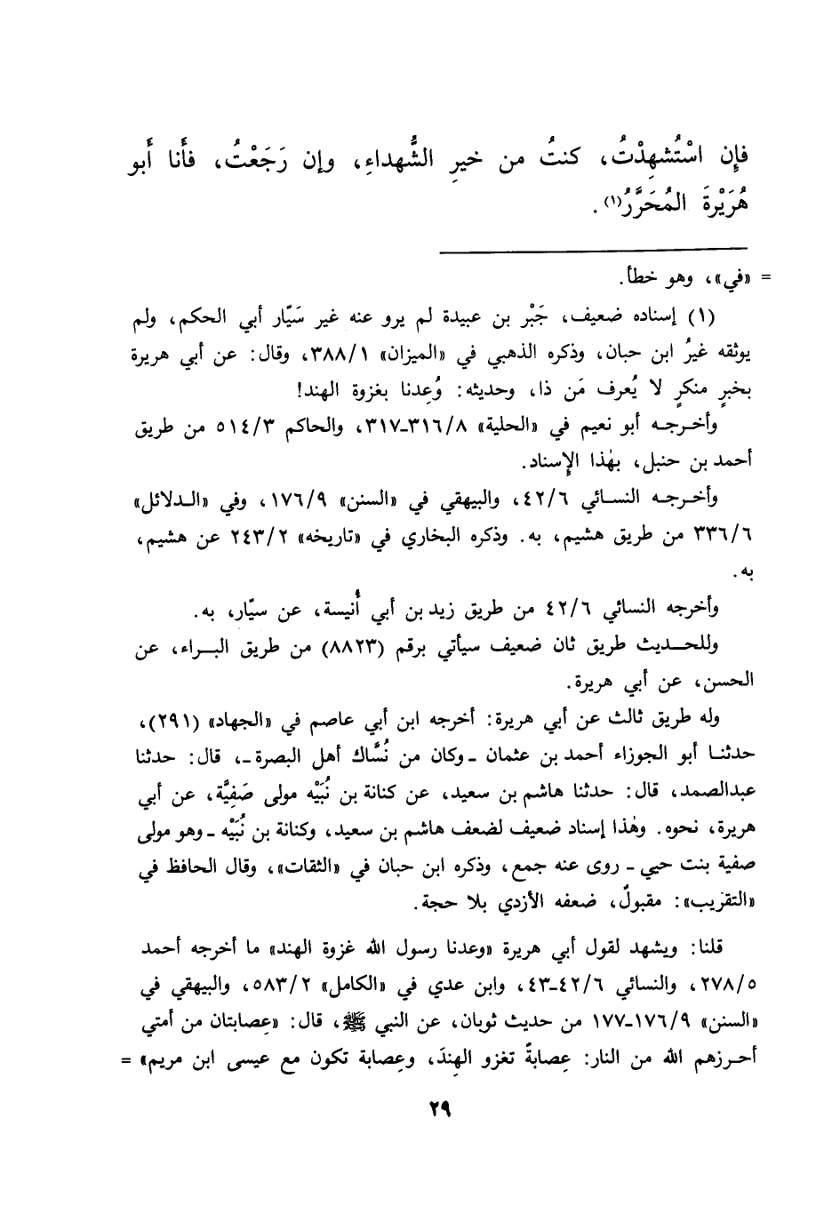 قلنا: ويشهد لقول أبي هريرة "وعدنا رسول الله غزوة الهند" ما أخرجه أحمد ٥/٢٧٨، والنسائي ٢/٤٦-٤٣، وابن عدي في "الكامل" ٢/٥٨٣، والبيهقي في "السنن" ٩/١٧٦-١٧٧ من حديث ثوبان، عن النبي صَلَّى اللهُ عَلَيْهِ وَسَلَّمَ، قال: "عصابتان من أمتي أحرزهم الله من النار: عصابة تغزو الهند، وعصابة تكون مع عيسى ابن مريم" =