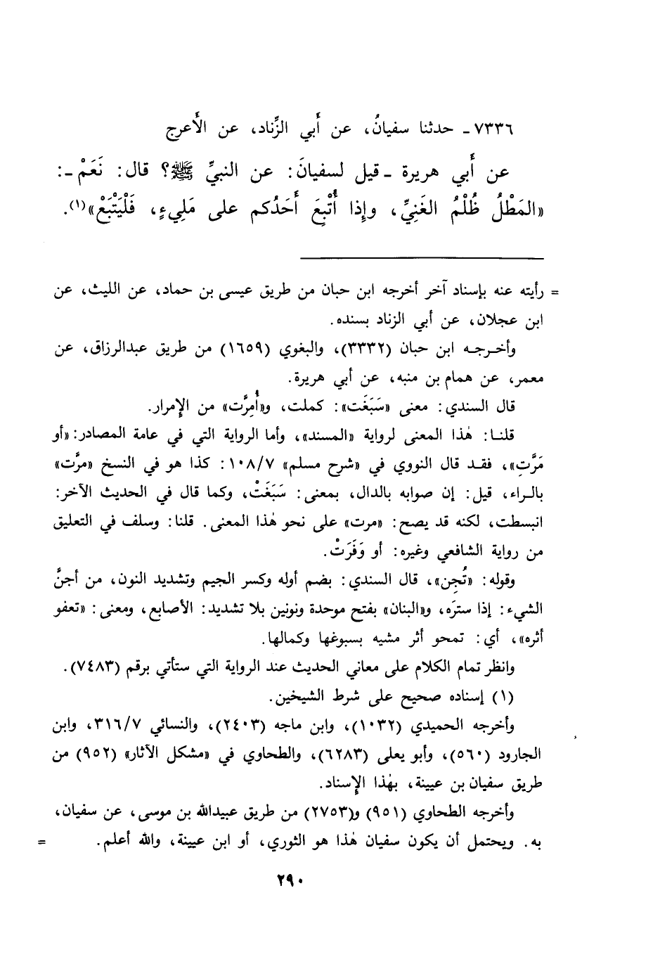 ٧٣٣٦ - حَدَّثَنَا سُفْيَانُ، عَنْ أَبِي الزِّنَادِ، عَنْ الْأَعْرَجِ، عَنْ أَبِي هُرَيْرَةَ - قِيلَ لِسُفْيَانَ: عَنِ النَّبِيِّ صَلَّى اللهُ عَلَيْهِ وَسَلَّمَ؟ قَالَ: نَعَمْ -: " الْمَطْلُ ظُلْمُ الْغَنِيِّ، وَإِذَا أُتْبِعَ أَحَدُكُمْ عَلَى مَلِيءٍ، فَلْيَتْبَعْ " (١)