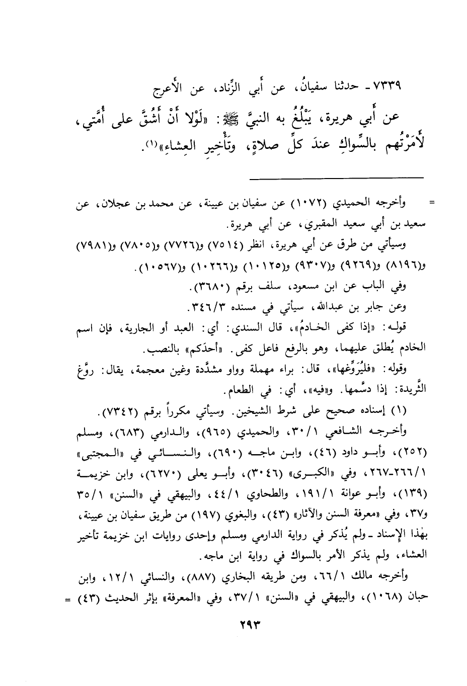 ٧٣٣٩ - حَدَّثَنَا سُفْيَانُ، عَنْ أَبِي الزِّنَادِ، عَنِ الْأَعْرَجِ، عَنْ أَبِي هُرَيْرَةَ، يَبْلُغُ بِهِ النَّبِيَّ صَلَّى اللهُ عَلَيْهِ وَسَلَّمَ: " لَوْلَا أَنْ أَشُقَّ عَلَى أُمَّتِي، لَأَمَرْتُهُمْ بِالسِّوَاكِ عِنْدَ كُلِّ صَلَاةٍ، وَتَأْخِيرِ الْعِشَاءِ " (١)