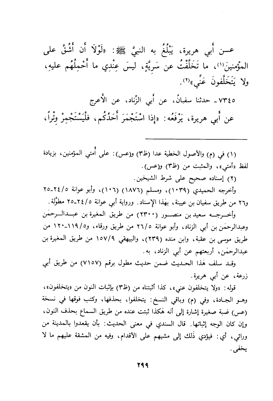 عَنْ أَبِي هُرَيْرَةَ، يَبْلُغُ بِهِ النَّبِيَّ صَلَّى اللهُ عَلَيْهِ وَسَلَّمَ: " لَوْلَا أَنْ أَشُقَّ عَلَى الْمُؤْمِنِينَ (١) ، مَا تَخَلَّفْتُ عَنْ سَرِيَّةٍ، لَيْسَ عِنْدِي مَا أَحْمِلُهُمْ عَلَيْهِ، وَلَا يَتَخَلَّفُونَ عَنِّي " (٢)