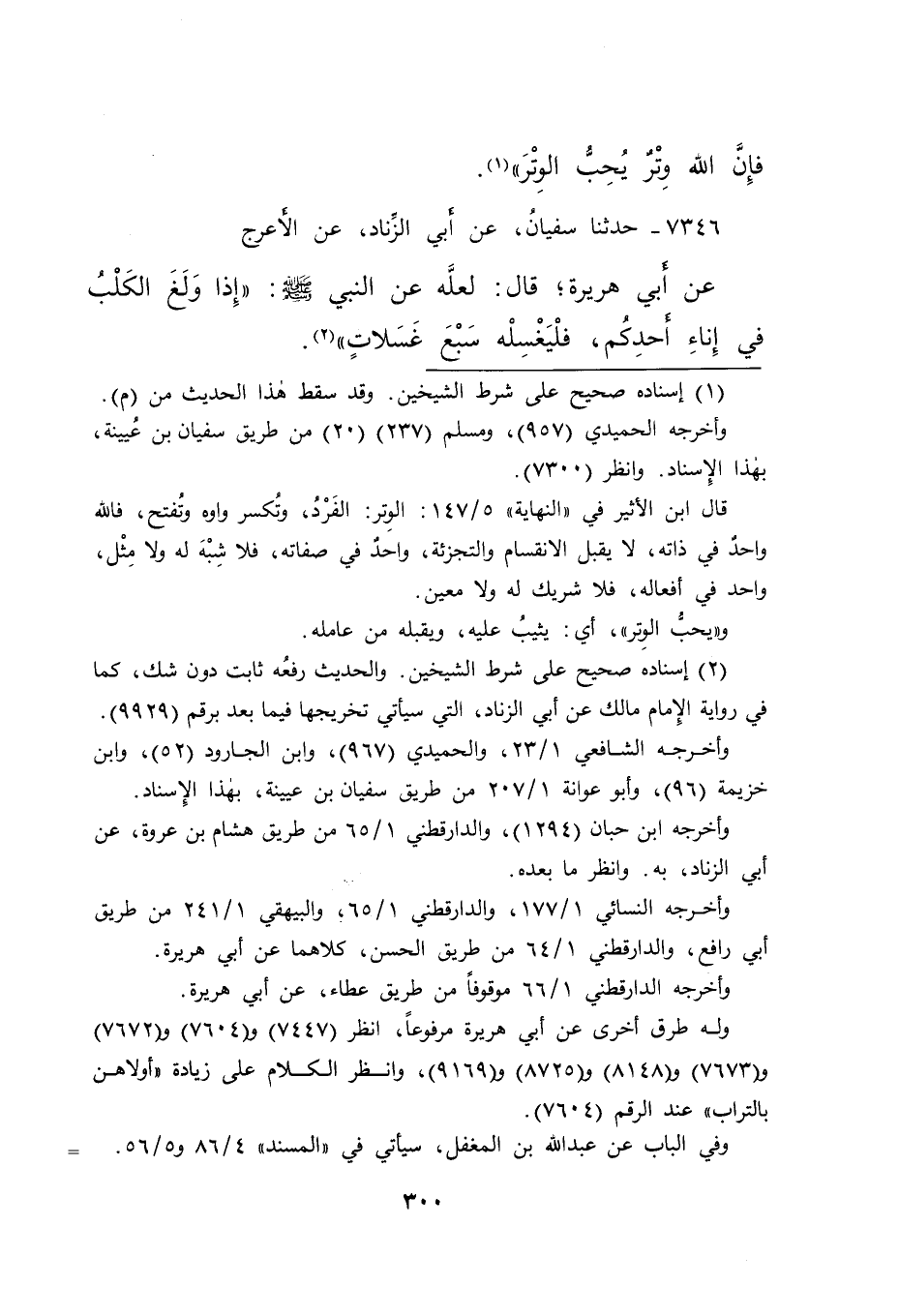 ٧٣٤٦ - حَدَّثَنَا سُفْيَانُ، عَنْ أَبِي الزِّنَادِ، عَنِ الْأَعْرَجِ، عَنْ أَبِي هُرَيْرَةَ، قَالَ: لَعَلَّهُ عَنِ النَّبِيِّ صَلَّى اللهُ عَلَيْهِ وَسَلَّمَ: " إِذَا وَلَغَ الْكَلْبُ فِي إِنَاءِ أَحَدِكُمْ، فَلْيَغْسِلْهُ سَبْعَ غَسَلَاتٍ " (٢)