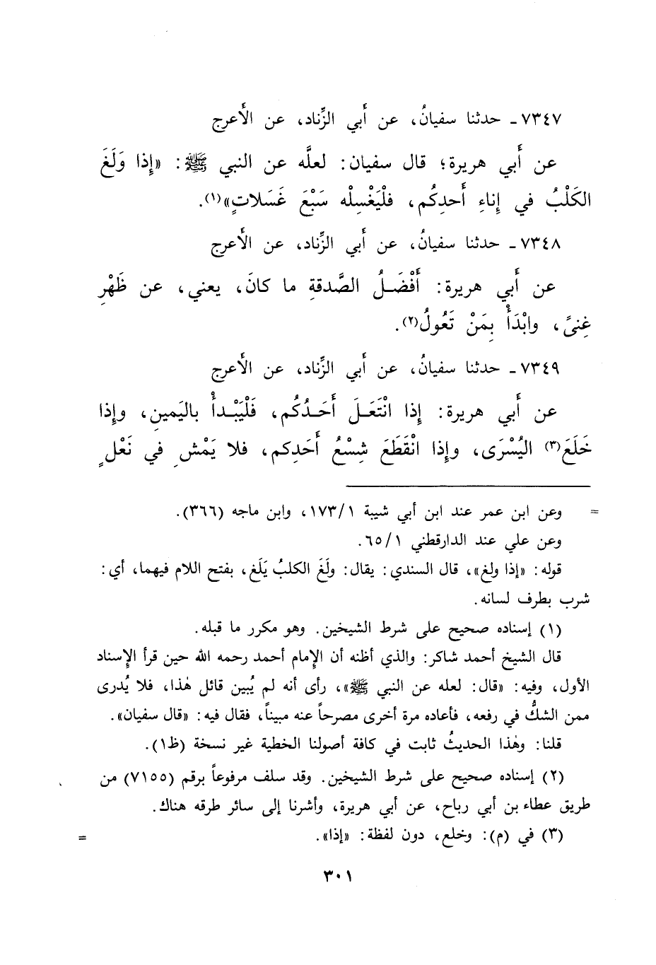 ٧٣٤٩ - حَدَّثَنَا سُفْيَانُ، عَنْ أَبِي الزِّنَادِ، عَنِ الْأَعْرَجِ، عَنْ أَبِي هُرَيْرَةَ: " إِذَا انْتَعَلَ أَحَدُكُمْ، فَلْيَبْدَأْ بِالْيَمِينِ، وِإِذَا خَلَعَ (٣) الْيُسْرَى، وَإِذَا انْقَطَعَ شِسْعُ أَحَدِكُمْ، فَلَا يَمْشِ فِي نَعْلٍ