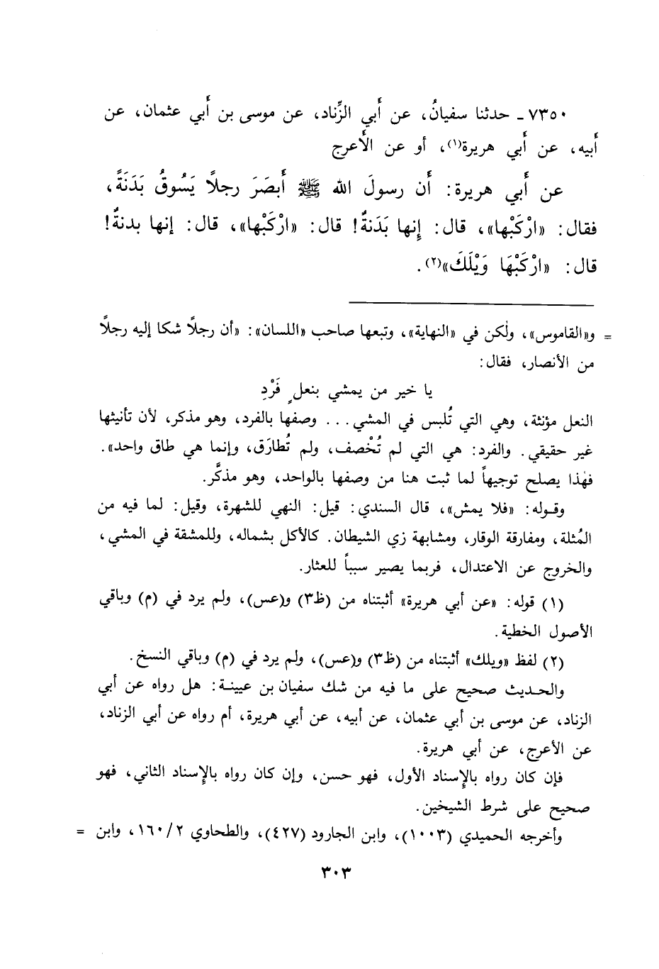 ٧٣٥٠ - حَدَّثَنَا سُفْيَانُ، عَنْ أَبِي الزِّنَادِ، عَنْ مُوسَى بْنِ أَبِي عُثْمَانَ، عَنْ أَبِيهِ، عَنْ أَبِي هُرَيْرَةَ (١) ، أَوْ عَنِ الْأَعْرَجِ، عَنْ أَبِي هُرَيْرَةَ، أَنَّ رَسُولَ اللهِ صَلَّى اللهُ عَلَيْهِ وَسَلَّمَ أَبْصَرَ رَجُلًا يَسُوقُ بَدَنَةً، فَقَالَ: " ارْكَبْهَا "، قَالَ: إِنَّهَا بَدَنَةٌ قَالَ: " ارْكَبْهَا "، قَالَ: إِنَّهَا بَدَنَةٌ قَالَ: " ارْكَبْهَا وَيْلَكَ " (٢)