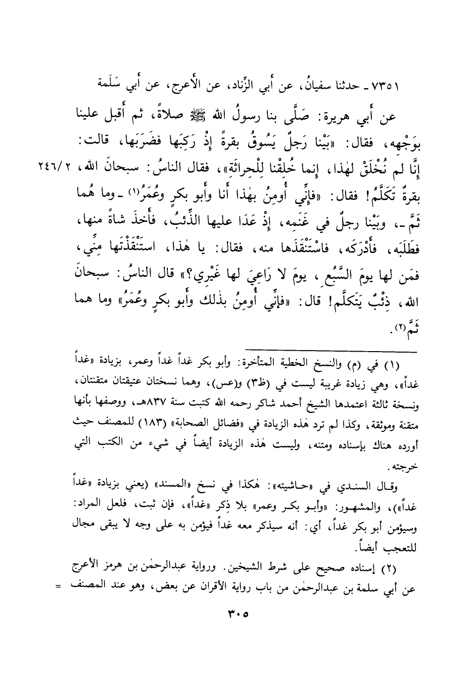 ٧٣٥١ - حَدَّثَنَا سُفْيَانُ، عَنْ أَبِي الزِّنَادِ، عَنِ الْأَعْرَجِ، عَنْ أَبِي سَلَمَةَ، عَنْ أَبِي هُرَيْرَةَ: صَلَّى بِنَا رَسُولُ اللهِ صَلَّى اللهُ عَلَيْهِ وَسَلَّمَ صَلَاةً، ثُمَّ أَقْبَلَ عَلَيْنَا بِوَجْهِهِ، فَقَالَ: " بَيْنَا رَجُلٌ يَسُوقُ بَقَرَةً إِذْ رَكِبَهَا فَضَرَبَهَا، قَالَتْ: إِنَّا لَمْ نُخْلَقْ لِهَذَا، إِنَّمَا خُلِقْنَا لِلْحِرَاثَةِ "، فَقَالَ النَّاسُ: سُبْحَانَ اللهِ، بَقَرَةٌ تَكَلَّمُ فَقَالَ: " فَإِنِّي أُومِنُ بِهَذَا أَنَا وَأَبُو بَكْرٍ، وَعُمَرُ (١) وَمَا هُمَا ثَمَّ، وَبَيْنَا رَجُلٌ فِي غَنَمِهِ، إِذْ عَدَا عَلَيْهَا الذِّئْبُ، فَأَخَذَ شَاةً مِنْهَا، فَطَلَبَهُ، فَأَدْرَكَهُ، فَاسْتَنْقَذَهَا مِنْهُ، فَقَالَ: يَا هَذَا، اسْتَنْقَذْتَهَا مِنِّي، فَمَنْ لَهَا يَوْمَ السَّبُعِ، يَوْمَ لَا رَاعِيَ لَهَا غَيْرِي؟ " قَالَ النَّاسُ: سُبْحَانَ اللهِ، ذِئْبٌ يَتَكَلَّمُ قَالَ: " إِنِّي أُومِنُ بِذَلِكَ وَأَبُو بَكْرٍ وَعُمَرُ " وَمَا هُمَا ثَمَّ (٢)
