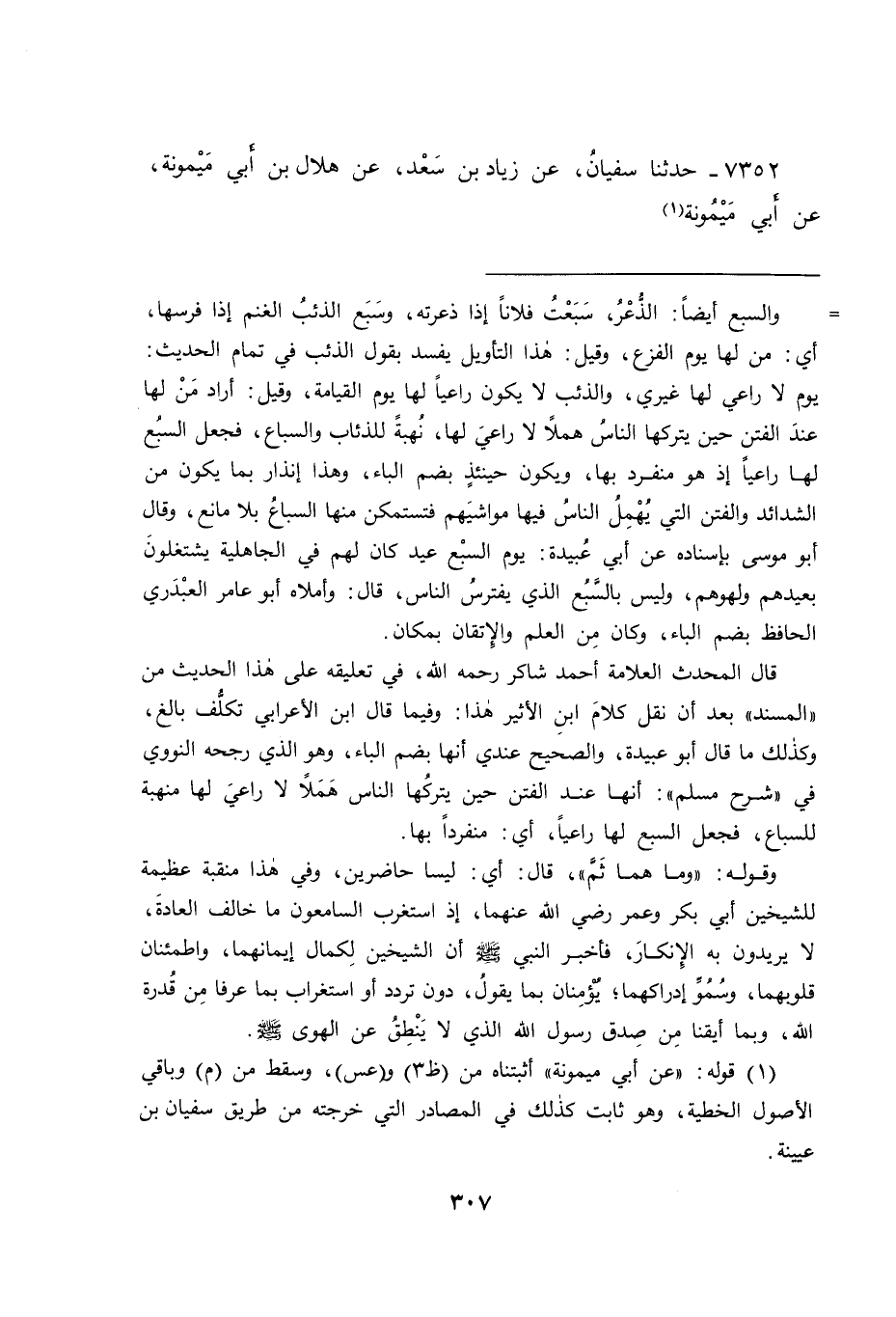قال المحدث العلامة أحمد شاكر رحمه الله، في تعليقه على هذا الحديث من "المسند" بعد أن نقل كلام ابن الأثير هذا: وفيما قال ابن الأعرابي تكلف بالغ، وكذلك ما قال أبو عبيدة، والصحيح عندي أنها بضم الباء، وهو الذي رجحه النووي في "شرح مسلم": أنها عند الفتن حين يتركها الناس هملا لا راعي لها منهبة للسباع، فجعل السبع لها راعيا، أي: منفردا بها.