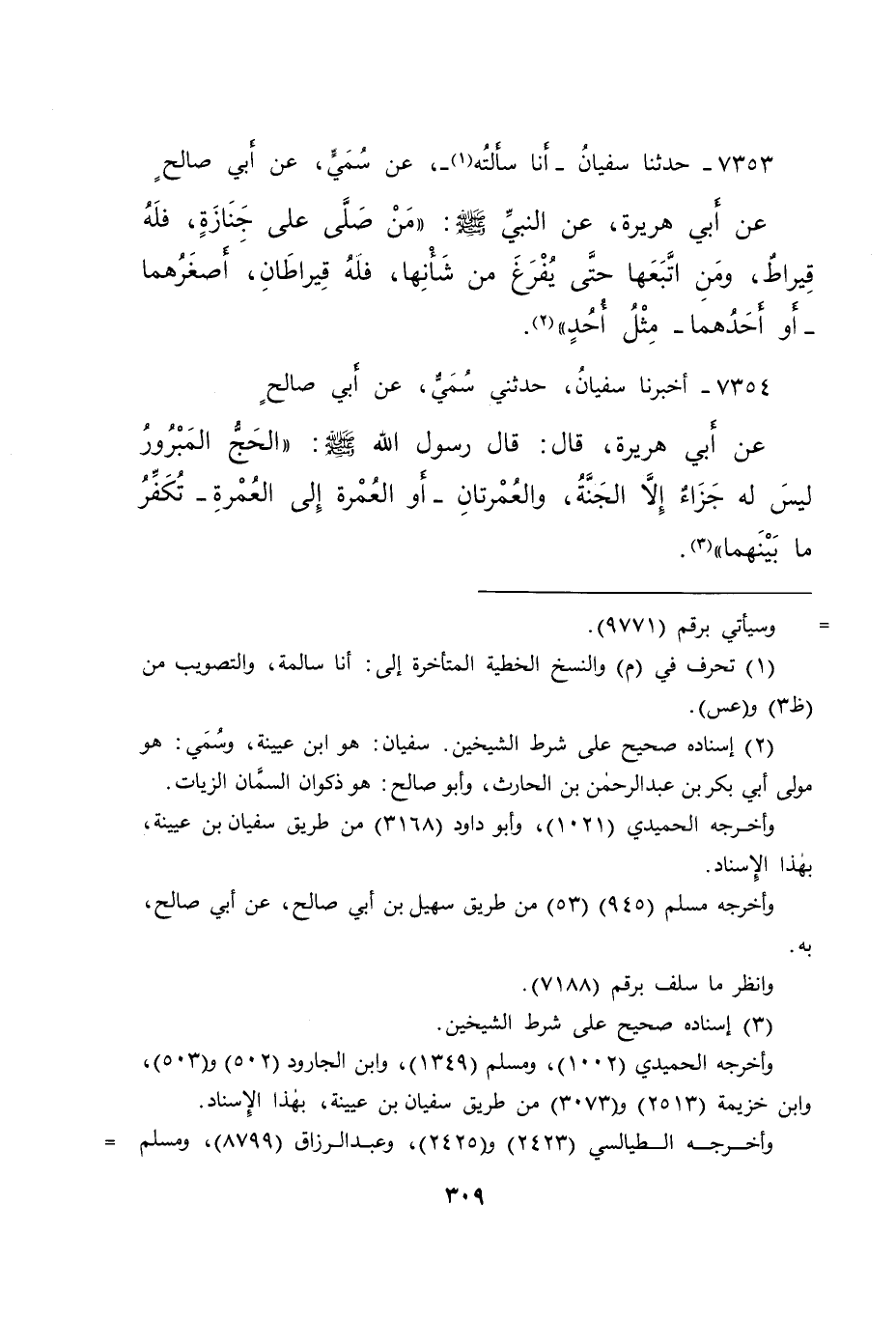 ٧٣٥٣ - حَدَّثَنَا سُفْيَانُ - أَنَا سَأَلْتُهُ (١) -، عَنْ سُمَيٍّ، عَنْ أَبِي صَالِحٍ، عَنْ أَبِي هُرَيْرَةَ، عَنِ النَّبِيِّ صَلَّى اللهُ عَلَيْهِ وَسَلَّمَ: " مَنْ صَلَّى عَلَى جَنَازَةٍ، فَلَهُ قِيرَاطٌ، وَمَنِ اتَّبَعَهَا حَتَّى يُفْرَغَ مِنْ شَأْنِهَا، فَلَهُ قِيرَاطَانِ، أَصْغَرُهُمَا أَوْ أَحَدُهُمَا مِثْلُ أُحُدٍ " (٢)