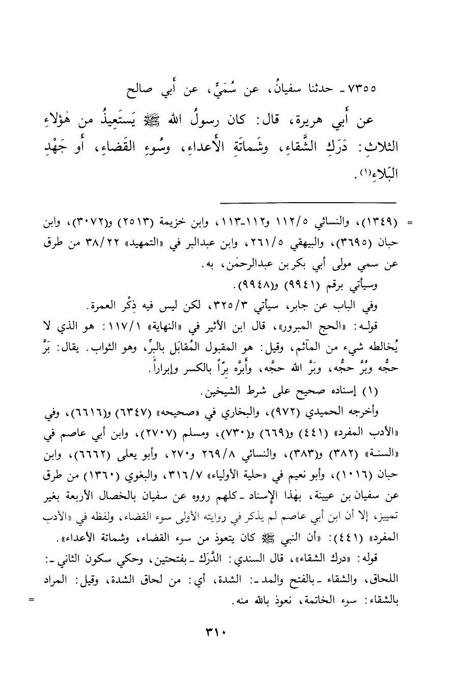 ٧٣٥٥ - حَدَّثَنَا سُفْيَانُ، عَنْ سُمَيٍّ، عَنْ أَبِي صَالِحٍ، عَنْ أَبِي هُرَيْرَةَ، قَالَ: كَانَ رَسُولُ اللهِ صَلَّى اللهُ عَلَيْهِ وَسَلَّمَ " يَسْتَعِيذُ مِنْ هَؤُلَاءِ الثَّلَاثِ: دَرَكِ الشَّقَاءِ، وَشَمَاتَةِ الْأَعْدَاءِ، وَسُوءِ الْقَضَاءِ، أَوْ جَهْدِ الْبَلَاءِ " (١)
