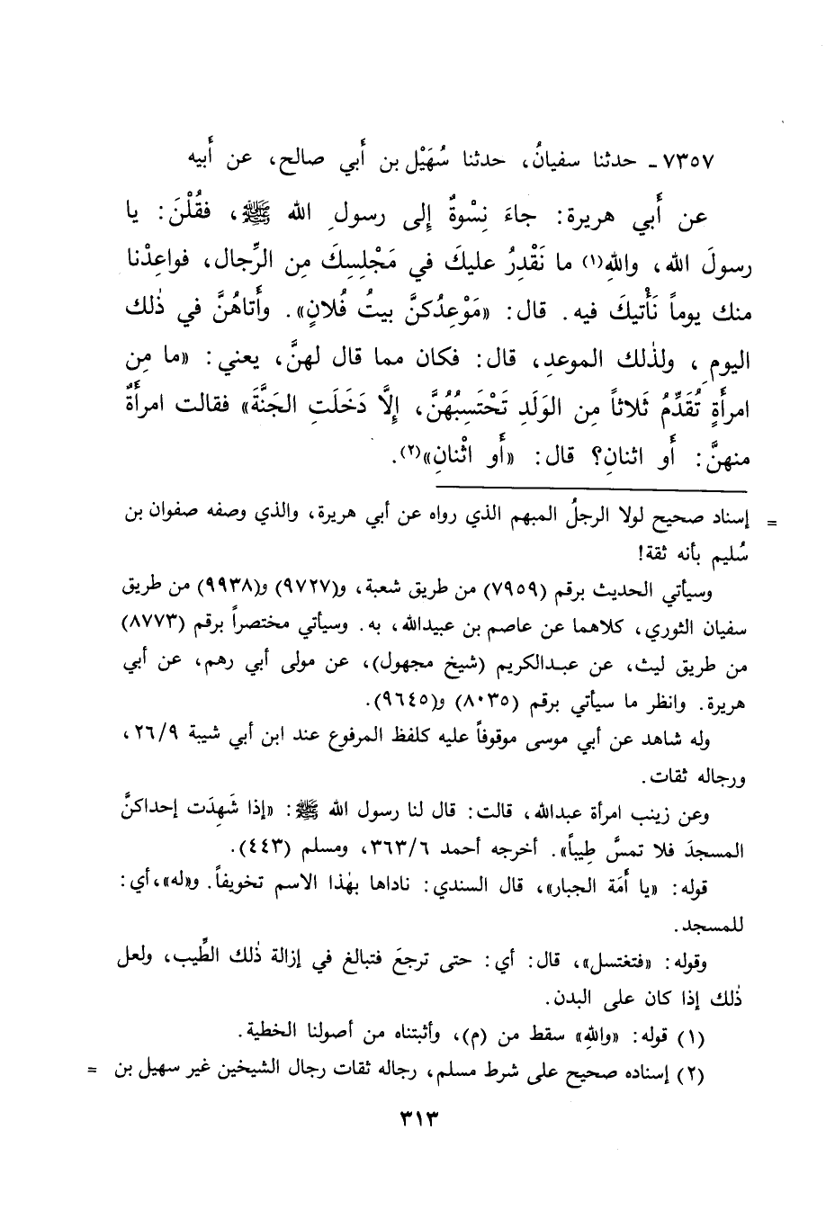 ٧٣٥٧ - حَدَّثَنَا سُفْيَانُ، حَدَّثَنَا سُهَيْلُ بْنُ أَبِي صَالِحٍ، عَنْ أَبِيهِ، عَنْ أَبِي هُرَيْرَةَ: جَاءَ نِسْوَةٌ إِلَى رَسُولِ اللهِ صَلَّى اللهُ عَلَيْهِ وَسَلَّمَ، فَقُلْنَ: يَا رَسُولَ اللهِ، وَاللهِ (١) مَا نَقْدِرُ عَلَيْكَ فِي مَجْلِسِكَ مِنَ الرِّجَالِ، فَوَاعِدْنَا مِنْكَ يَوْمًا نَأْتِيكَ فِيهِ. قَالَ: " مَوْعِدُكُنَّ بَيْتُ فُلَانٍ ". وَأَتَاهُنَّ فِي ذَلِكَ الْيَوْمِ، وَلِذَلِكَ الْمَوْعِدِ، قَالَ: فَكَانَ مِمَّا قَالَ لَهُنَّ، يَعْنِي: " مَا مِنِ امْرَأَةٍ تُقَدِّمُ ثَلَاثًا مِنَ الْوَلَدِ تَحْتَسِبُهُنَّ، إِلَّا دَخَلَتِ الْجَنَّةَ " فَقَالَتِ امْرَأَةٌ مِنْهُنَّ: أَوِ اثْنَانِ؟ قَالَ: " أَوِ اثْنَانِ " (٢)