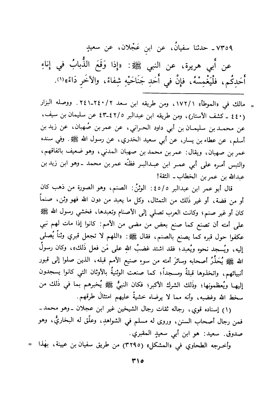٧٣٥٩ - حَدَّثَنَا سُفْيَانُ، عَنِ ابْنِ الْعَجْلَانِ، عَنْ سَعِيدٍ، عَنْ أَبِي هُرَيْرَةَ، عَنِ النَّبِيِّ صَلَّى اللهُ عَلَيْهِ وَسَلَّمَ: " إِذَا وَقَعَ الذُّبَابُ فِي إِنَاءِ أَحَدِكُمْ، فَلْيَغْمِسْهُ، فَإِنَّ فِي أَحَدِ جَنَاحَيْهِ شِفَاءً، وَالْآخَرِ دَاءً " (١)