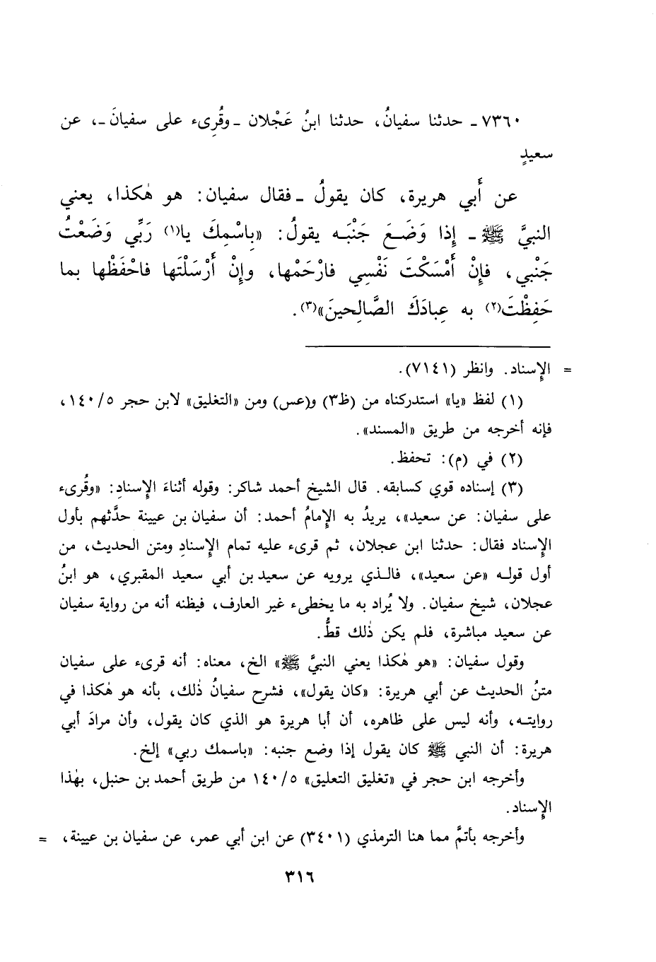 ٧٣٦٠ - حَدَّثَنَا سُفْيَانُ، حَدَّثَنَا ابْنُ عَجْلَانَ، وَقُرِئَ عَلَى سُفْيَانَ، عَنْ سَعِيدٍ، عَنْ أَبِي هُرَيْرَةَ، كَانَ يَقُولُ - فَقَالَ سُفْيَانُ: هُوَ هَكَذَا - يَعْنِي النَّبِيَّ صَلَّى اللهُ عَلَيْهِ وَسَلَّمَ إِذَا وَضَعَ جَنْبَهُ يَقُولُ: " بِاسْمِكَ يا (١) رَبِّي وَضَعْتُ جَنْبِي، فَإِنْ أَمْسَكْتَ نَفْسِي فَارْحَمْهَا، وَإِنْ أَرْسَلْتَهَا فَاحْفَظْهَا بِمَا حَفِظْتَ (٢) بِهِ عِبَادَكَ الصَّالِحِينَ " (٣)