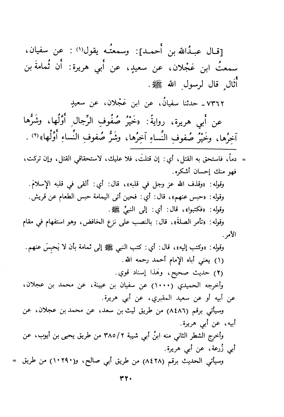 قَالَ عَبْدُ اللهِ بْنُ أَحْمَدَ: وَسَمِعْتُهُ يَقُولُ (١) : عَنْ سُفْيَانَ، سَمِعْتُ ابْنَ عَجْلَانَ، عَنْ سَعِيدٍ، عَنْ أَبِي هُرَيْرَةَ، أَنَّ ثُمَامَةَ بْنَ أُثَالٍ قَالَ لِرَسُولِ اللهِ صَلَّى اللهُ عَلَيْهِ وَسَلَّمَ
