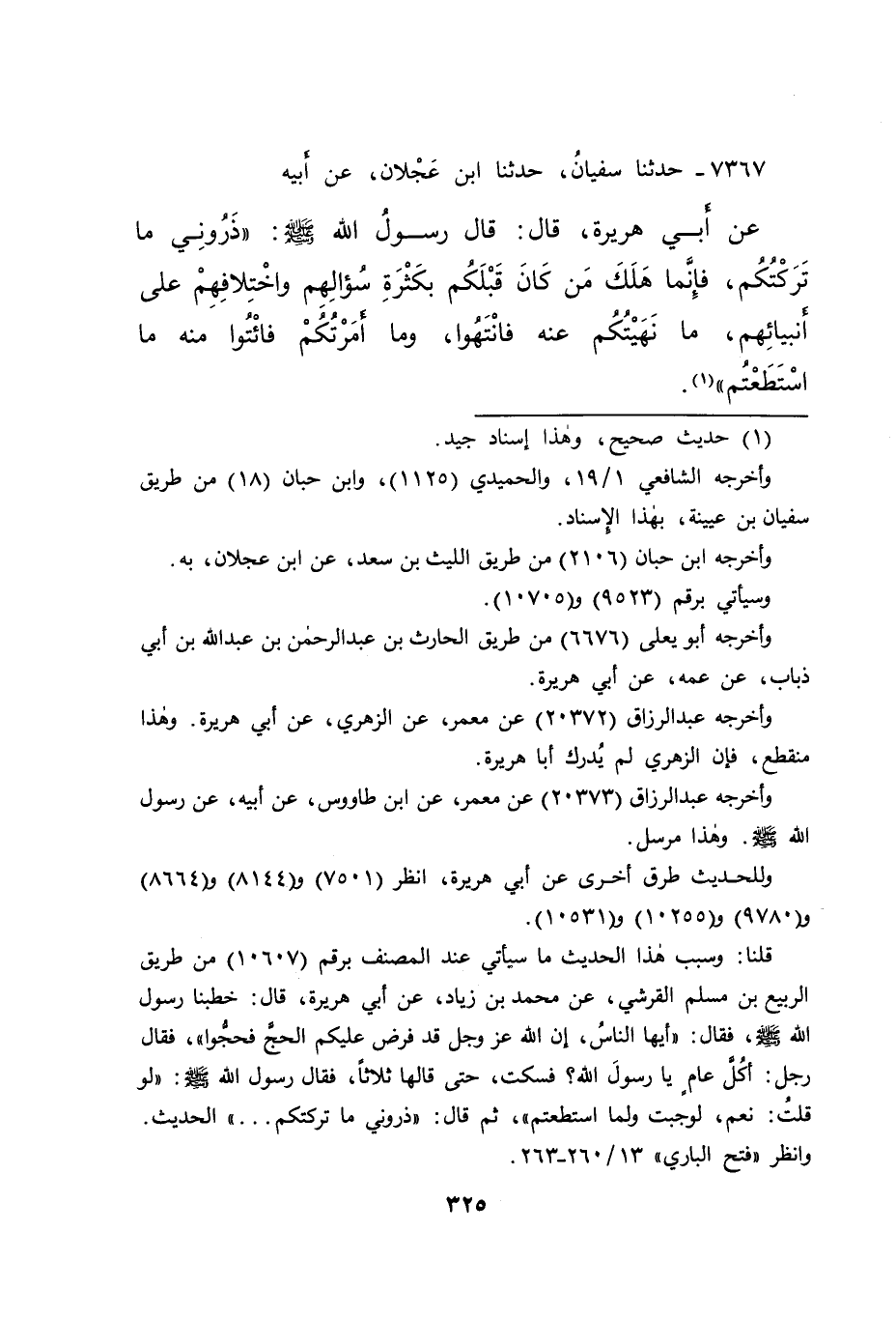 ٧٣٦٧ - حَدَّثَنَا سُفْيَانُ، حَدَّثَنَا ابْنُ عَجْلَانَ، عَنْ أَبِيهِ، عَنْ أَبِي هُرَيْرَةَ، قَالَ: قَالَ رَسُولُ اللهِ صَلَّى اللهُ عَلَيْهِ وَسَلَّمَ: " ذَرُونِي مَا تَرَكْتُكُمْ، فَإِنَّمَا هَلَكَ مَنْ كَانَ قَبْلَكُمْ بِكَثْرَةِ سُؤَالِهِمْ وَاخْتِلَافِهِمْ عَلَى أَنْبِيَائِهِمْ، مَا نَهَيْتُكُمْ عَنْهُ فَانْتَهُوا، وَمَا أَمَرْتُكُمْ فَأْتُوا مِنْهُ مَا اسْتَطَعْتُمْ " (١)