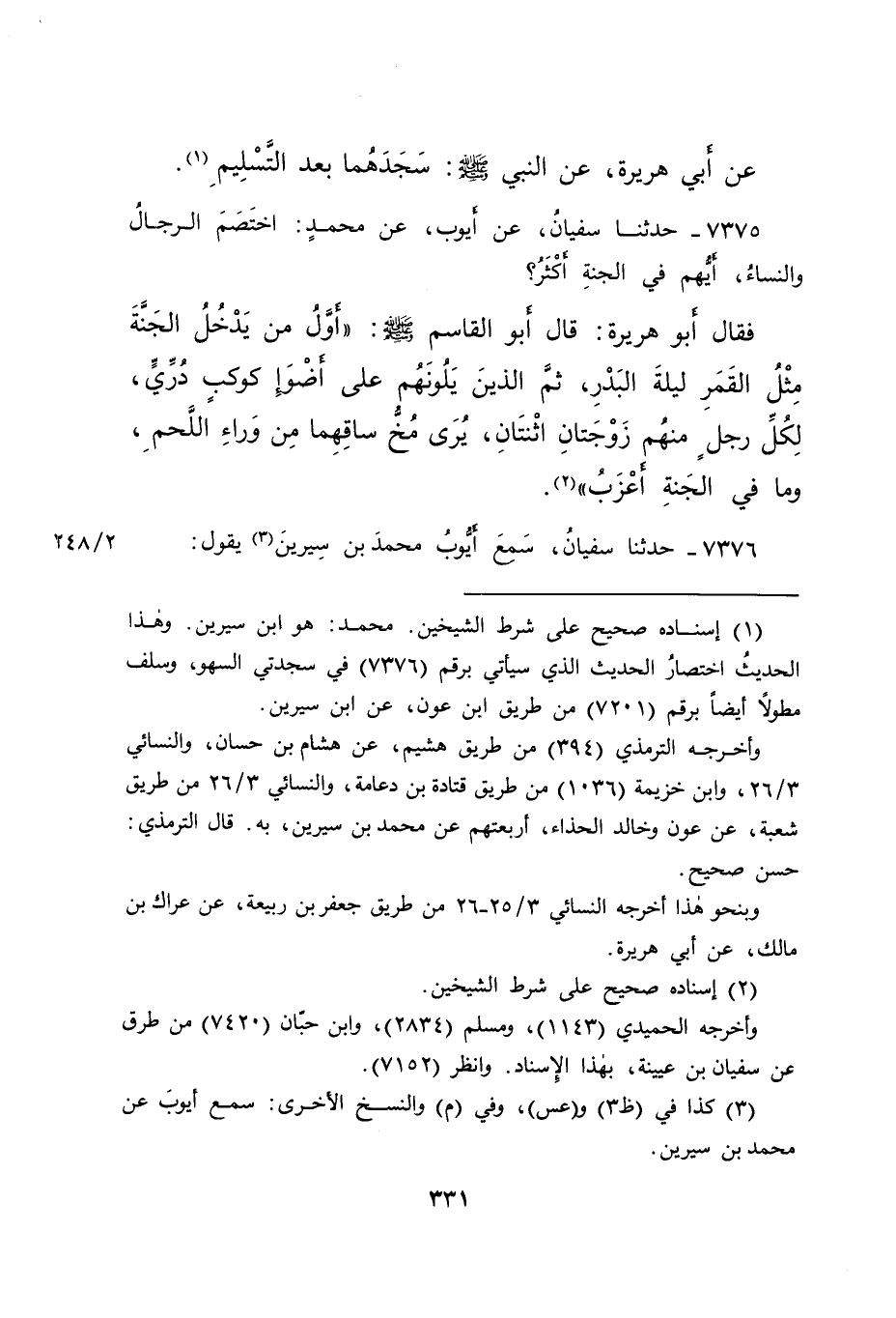 ٧٣٧٥ - حَدَّثَنَا سُفْيَانُ، عَنْ أَيُّوبَ، عَنْ مُحَمَّدٍ: اخْتَصَمَ الرِّجَالُ وَالنِّسَاءُ، أَيُّهُمْ فِي الْجَنَّةِ أَكْثَرُ؟ فَقَالَ أَبُو هُرَيْرَةَ: قَالَ أَبُو الْقَاسِمِ صَلَّى اللهُ عَلَيْهِ وَسَلَّمَ: " أَوَّلُ مَنْ يَدْخُلُ الْجَنَّةَ مِثْلُ الْقَمَرِ لَيْلَةَ الْبَدْرِ، ثُمَّ الَّذِينَ يَلُونَهُمْ عَلَى أَضْوَإِ كَوْكَبٍ دُرِّيٍّ، لِكُلِّ رَجُلٍ مِنْهُمْ زَوْجَتَانِ اثْنَتَانِ، يُرَى مُخُّ سَاقِهِمَا مِنْ وَرَاءِ اللَّحْمِ، وَمَا فِي الْجَنَّةِ أَعْزَبُ " (٢)