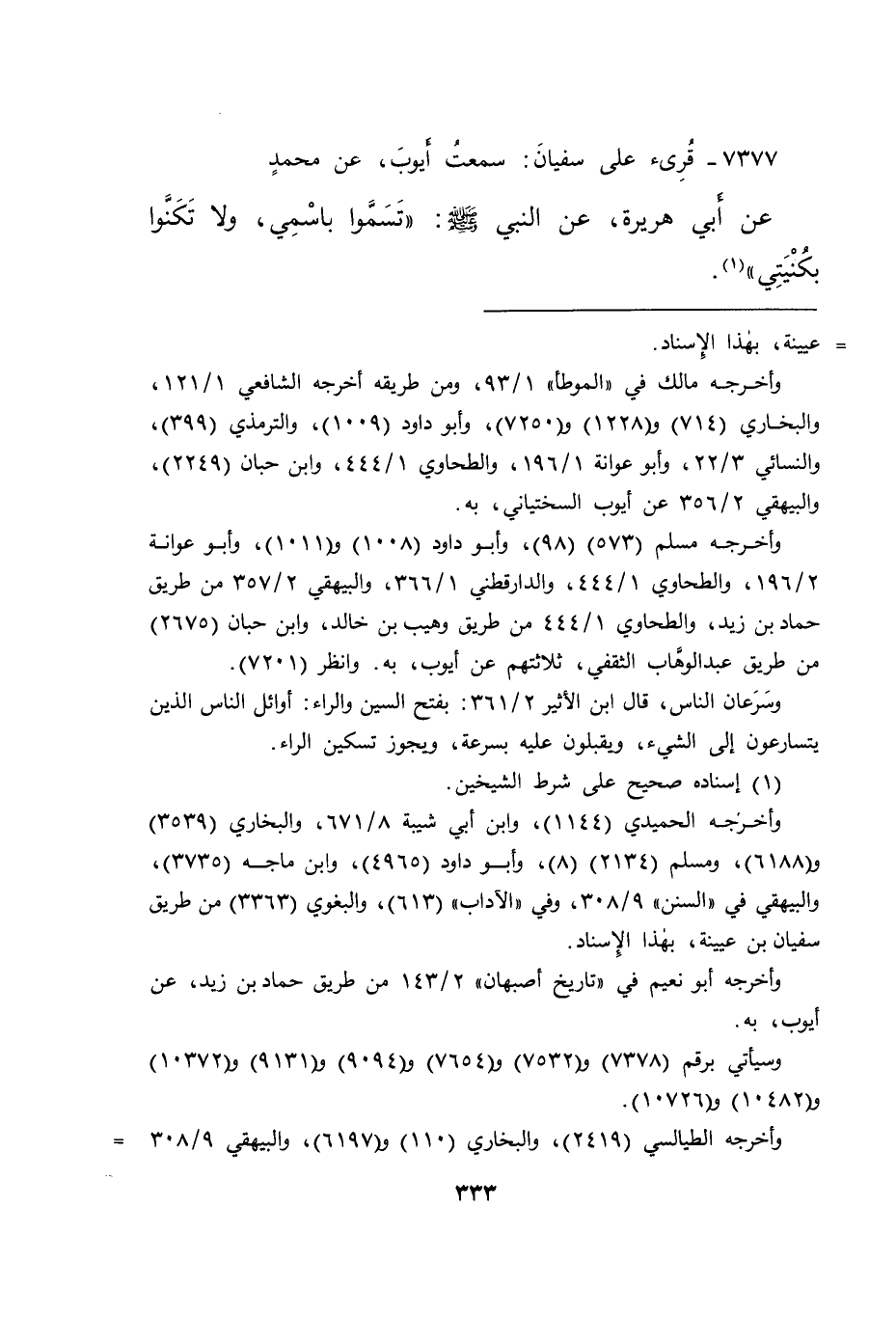 ٧٣٧٧ - قُرِئَ عَلَى سُفْيَانَ، سَمِعْتُ أَيُّوبَ، عَنْ مُحَمَّدٍ، عَنْ أَبِي هُرَيْرَةَ، عَنِ النَّبِيِّ صَلَّى اللهُ عَلَيْهِ وَسَلَّمَ: " تَسَمَّوْا بِاسْمِي، وَلَا تَكَنَّوْا بِكُنْيَتِي " (١)