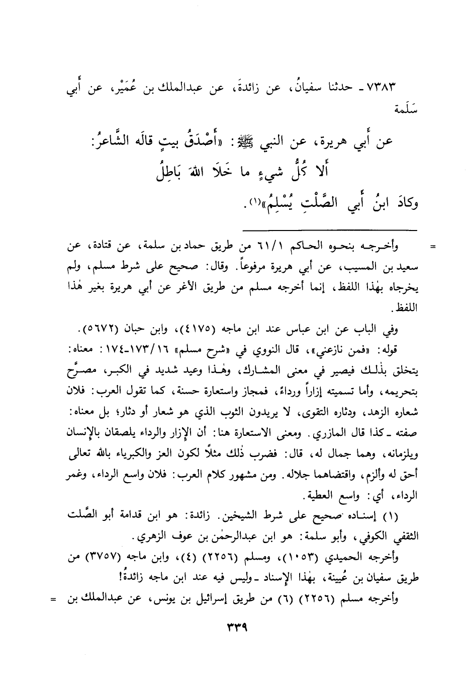 ٧٣٨٣ - حَدَّثَنَا سُفْيَانُ، عَنْ زَائِدَةَ، عَنْ عَبْدِ الْمَلِكِ بْنِ عُمَيْرٍ، عَنْ أَبِي سَلَمَةَ، عَنْ أَبِي هُرَيْرَةَ، عَنِ النَّبِيِّ صَلَّى اللهُ عَلَيْهِ وَسَلَّمَ: " أَصْدَقُ بَيْتٍ قَالَهُ الشَّاعِرُ: