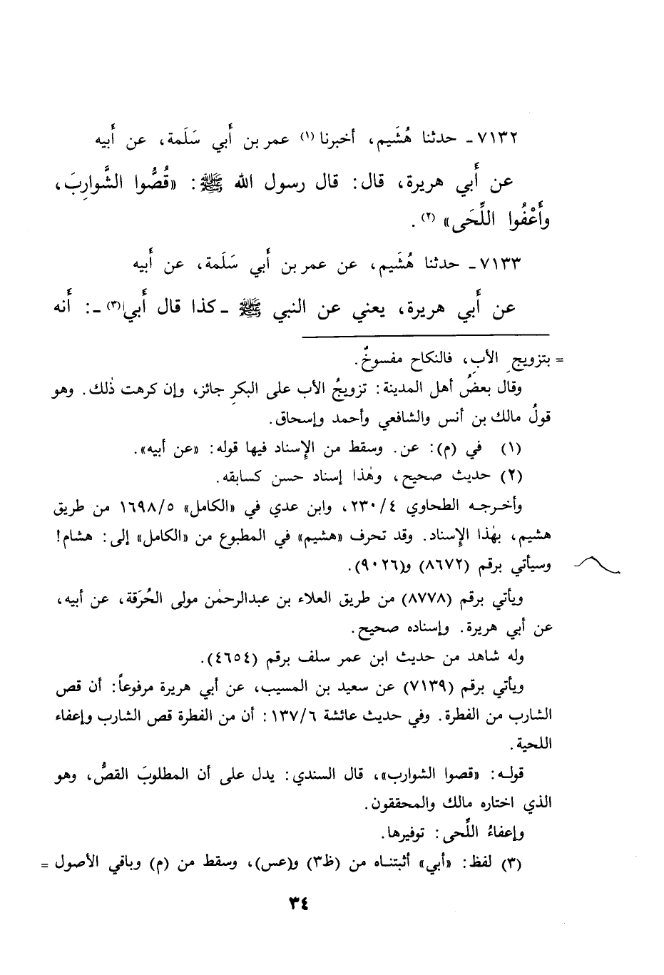٧١٣٢ - حَدَّثَنَا هُشَيْمٌ، أَخْبَرَنَا (١) عُمَرُ بْنُ أَبِي سَلَمَةَ، عَنْ أَبِيهِ، عَنْ أَبِي هُرَيْرَةَ، قَالَ: قَالَ رَسُولُ اللهِ صَلَّى اللهُ عَلَيْهِ وَسَلَّمَ: " قُصُّوا الشَّوَارِبَ، وَأَعْفُوا اللِّحَى " (٢)
