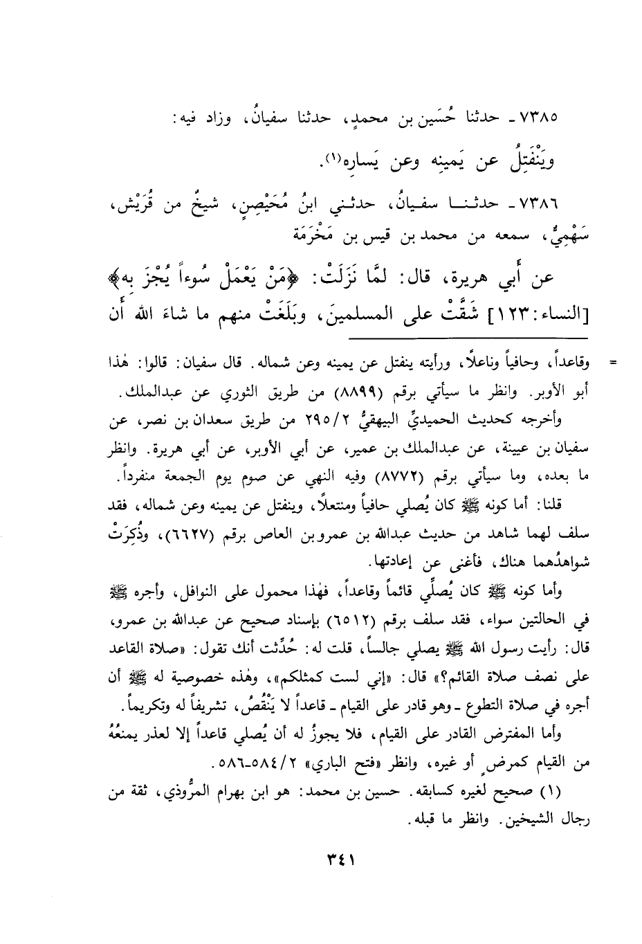 ٧٣٨٥ - حَدَّثَنَا حُسَيْنُ بْنُ مُحَمَّدٍ، حَدَّثَنَا سُفْيَانُ، وَزَادَ فِيهِ: وَيَنْفَتِلُ عَنْ يَمِينِهِ وَعَنْ يَسَارِهِ (١)