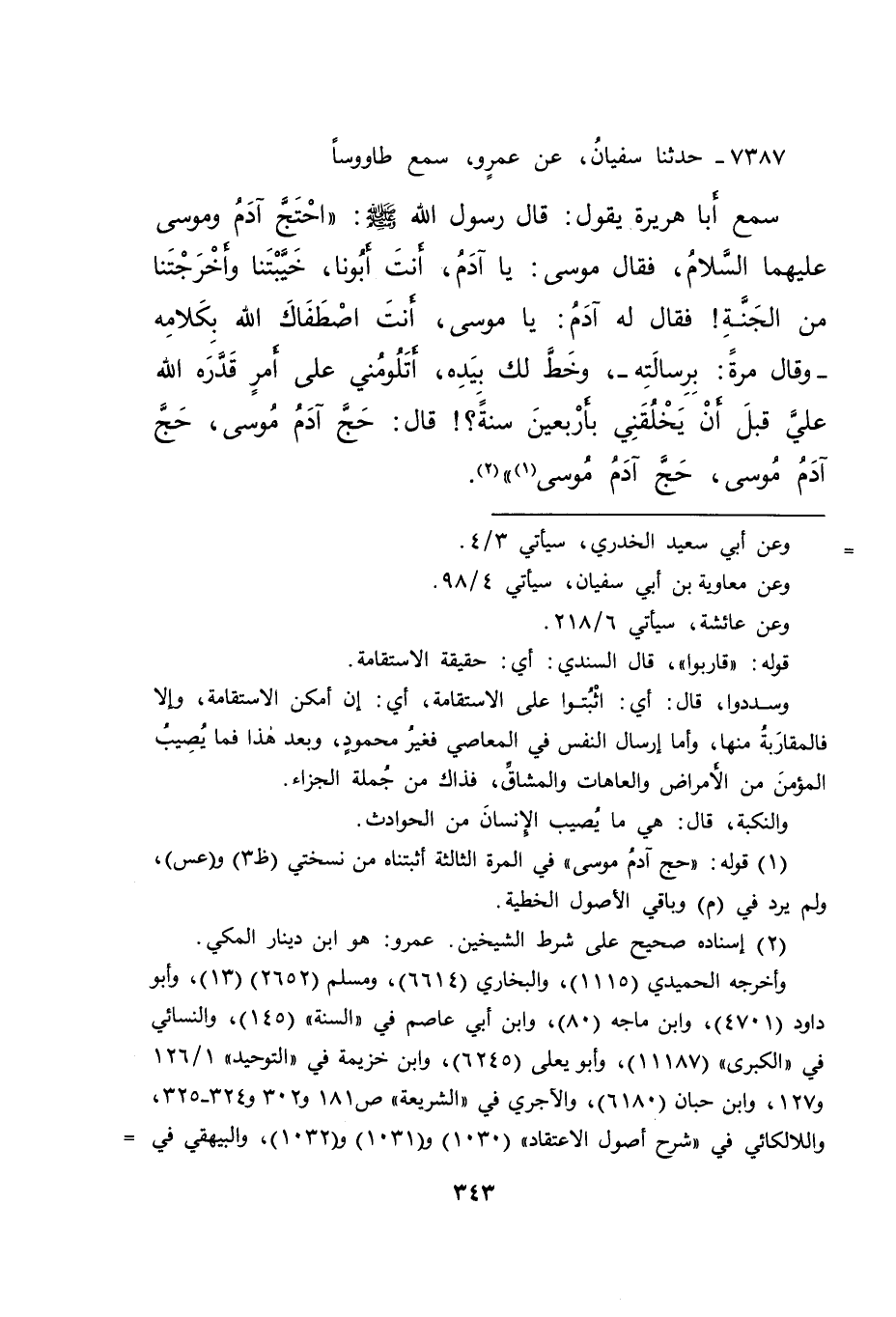 ٧٣٨٧ - حَدَّثَنَا سُفْيَانُ، عَنْ عَمْرٍو، سَمِعَ طَاوُسًا، سَمِعَ أَبَا هُرَيْرَةَ، يَقُولُ: قَالَ رَسُولُ اللهِ صَلَّى اللهُ عَلَيْهِ وَسَلَّمَ: " احْتَجَّ آدَمُ وَمُوسَى عَلَيْهِمَا السَّلَامُ، فَقَالَ مُوسَى: يَا آدَمُ، أَنْتَ أَبُونَا، خَيَّبْتَنَا وَأَخْرَجْتَنَا مِنَ الْجَنَّةِ فَقَالَ لَهُ آدَمُ: يَا مُوسَى، أَنْتَ اصْطَفَاكَ اللهُ بِكَلَامِهِ - وَقَالَ مَرَّةً: بِرِسَالَتِهِ -، وَخَطَّ لَكَ بِيَدِهِ، أَتَلُومُنِي عَلَى أَمْرٍ قَدَّرَهُ اللهُ عَلَيَّ قَبْلَ أَنْ يَخْلُقَنِي بِأَرْبَعِينَ سَنَةً؟ قَالَ: حَجَّ آدَمُ مُوسَى، حَجَّ آدَمُ مُوسَى، حَجَّ آدَمُ مُوسَى (١) " (٢)