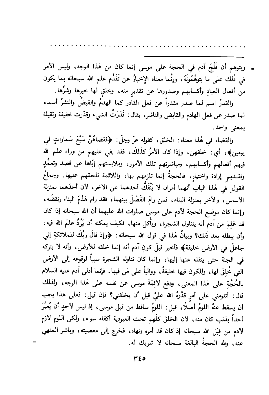 = ويتوهم أن فلج آدم في الحجة على موسى إنما كان من هذا الوجه، وليس الأمر في ذلك على ما يتوهمونه، وإنما معناه الإخبار عن تقدم علم الله سبحانه بما يكون من أفعال العباد وأكسابهم وصدورها عن تقدير منه، وخلق لها خيرها وشرها.