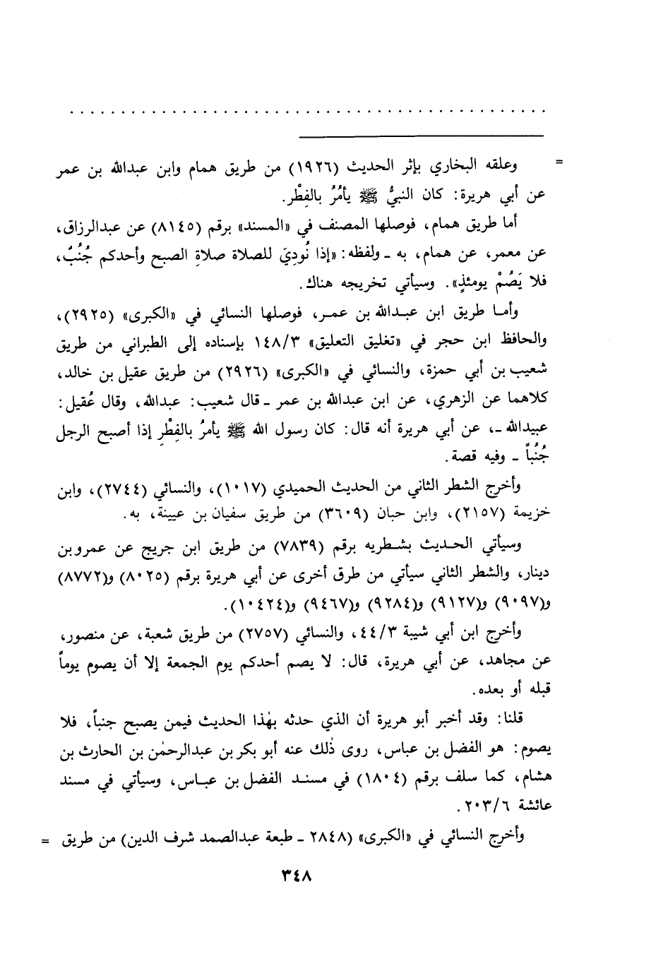 أما طريق همام، فوصلها المصنف في "المسند" برقم (٨١٤٥) عن عبد الرزاق، عن معمر، عن همام، به - ولفظه: "إذا نوي للصلاة صلاة الصبح وأحدكم جنب، فلا يصم يومئذ". وسيأتي تخريجه هناك.