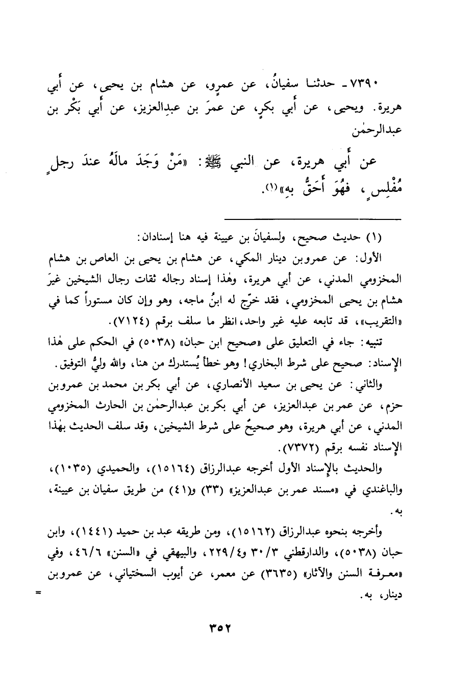 ٧٣٩٠ - حَدَّثَنَا سُفْيَانُ، عَنْ عَمْرٍو، عَنْ هِشَامِ بْنِ يَحْيَى، عَنْ أَبِي هُرَيْرَةَ، وَيَحْيَى، عَنْ أَبِي بَكْرٍ، عَنْ عُمَرَ بْنِ عَبْدِ الْعَزِيزِ، عَنْ أَبِي بَكْرِ بْنِ عَبْدِ الرَّحْمَنِ، عَنْ أَبِي هُرَيْرَةَ، عَنِ النَّبِيِّ صَلَّى اللهُ عَلَيْهِ وَسَلَّمَ: " مَنْ وَجَدَ مَالَهُ عِنْدَ رَجُلٍ مُفْلِسٍ، فَهُوَ أَحَقُّ بِهِ " (١)