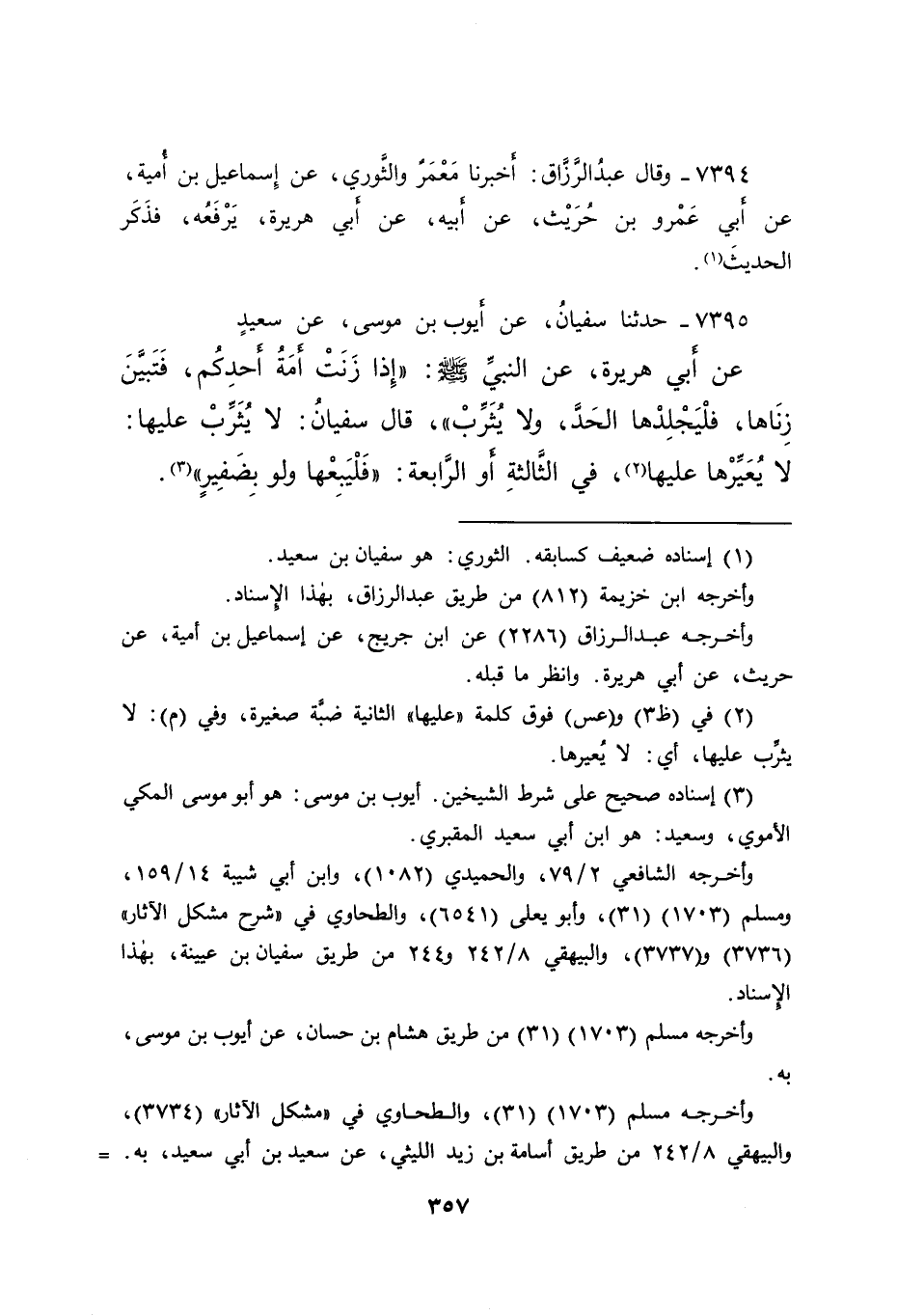 ٧٣٩٥ - حَدَّثَنَا سُفْيَانُ، عَنْ أَيُّوبَ بْنِ مُوسَى، عَنْ سَعِيدٍ، عَنْ أَبِي هُرَيْرَةَ، عَنِ النَّبِيِّ صَلَّى اللهُ عَلَيْهِ وَسَلَّمَ: " إِذَا زَنَتْ أَمَةُ أَحَدِكُمْ، فَتَبَيَّنَ زِنَاهَا، فَلْيَجْلِدْهَا الْحَدَّ، وَلَا يُثَرِّبْ " قَالَ سُفْيَانُ: " لَا يُثَرِّبْ عَلَيْهَا: لَا يُعَيِّرْهَا عَلَيْهَا (٢) ، فِي الثَّالِثَةِ أَوِ الرَّابِعَةِ: فَلْيَبِعْهَا وَلَوْ بِضَفِيرٍ " (٣)